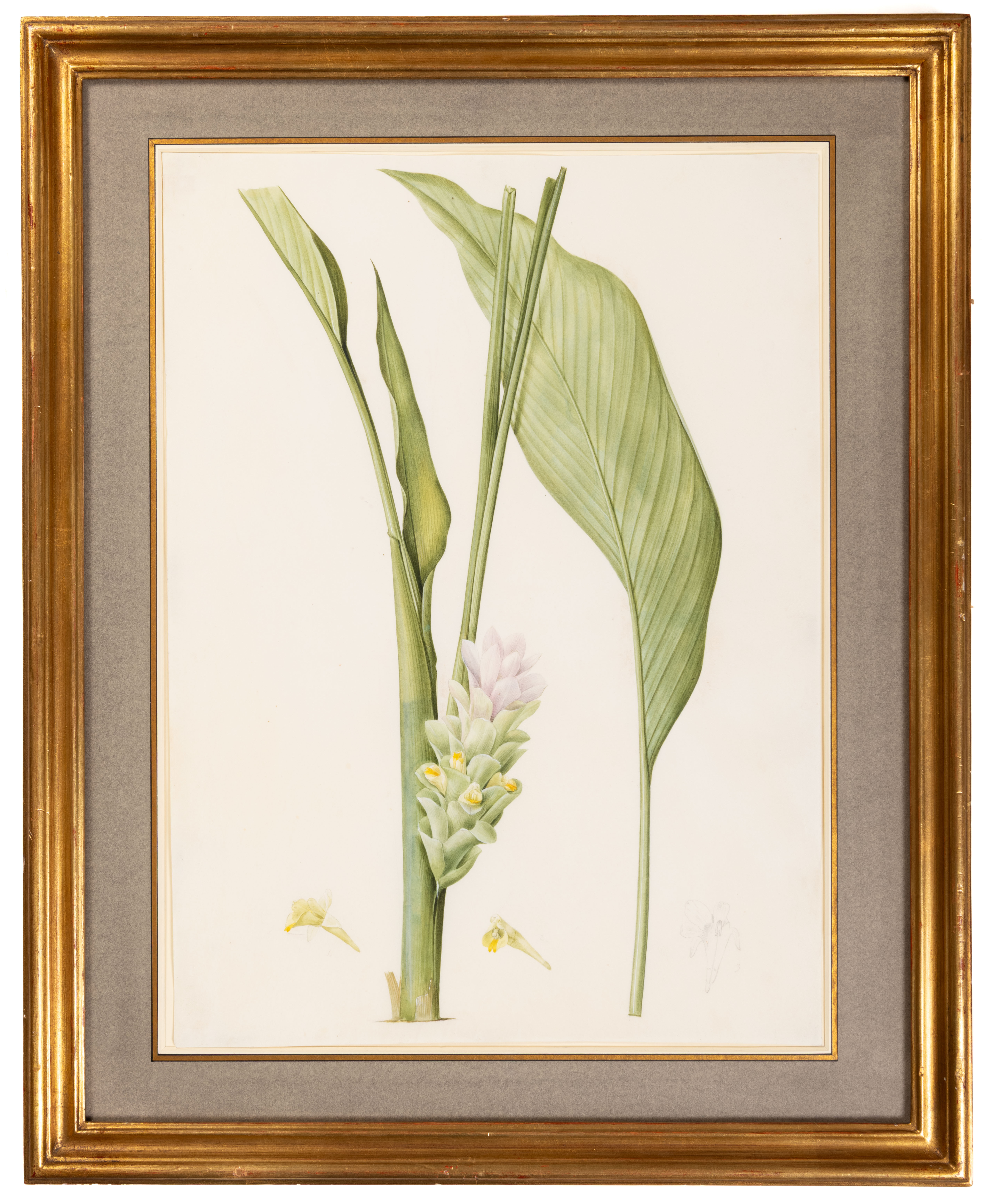 Despite its title, Redouté’s Les Liliaceés included not only plants of the Liliaceae family, which in fact account for only about half of the species illustrated, but also numerous other species of monocots with petal-like flowers; all from the gardens of Malmaison, Saint-Cloud, Sèvres and Versailles. Les Liliaceés includes depictions of plants from, among others, the families Agavaceae, Alismaceae, Amaryllidaceae, Cannaceae, Iridaceae, Strelitziaceae and, as in the case of the present sheet, Ziniberaceae, or ginger family. Turmeric is a flowering plant native to the Indian subcontinent and Southeast Asia. Its roots, when ground into powder, are often used for medicinal and cooking purposes (particularly as a spice for curries) and also for dyeing fabric. At the Jardin des Plantes in Paris, and likely at Malmaison as well, the turmeric plant flowers in the month of August, which is probably when Redouté painted it.