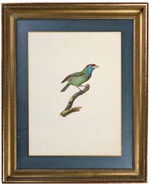 This large watercolour by Jacques Barraband is a preparatory study for one of the 197 engraved plates in François Levaillant’s two-volume 'Histoire naturelle des oiseaux de paradis et des rolliers, suivie des celle des toucans et des barbus', appearing in reverse in the published work. The drawing depicts the blue-throated barbet (Megalaima asiatica), a member of the Asian barbet family of birds native to Southeast Asia and the Indian subcontinent. Characterized by bright green, blue and red feathers, barbets get their name from the bristles which fringe their heavy bills.