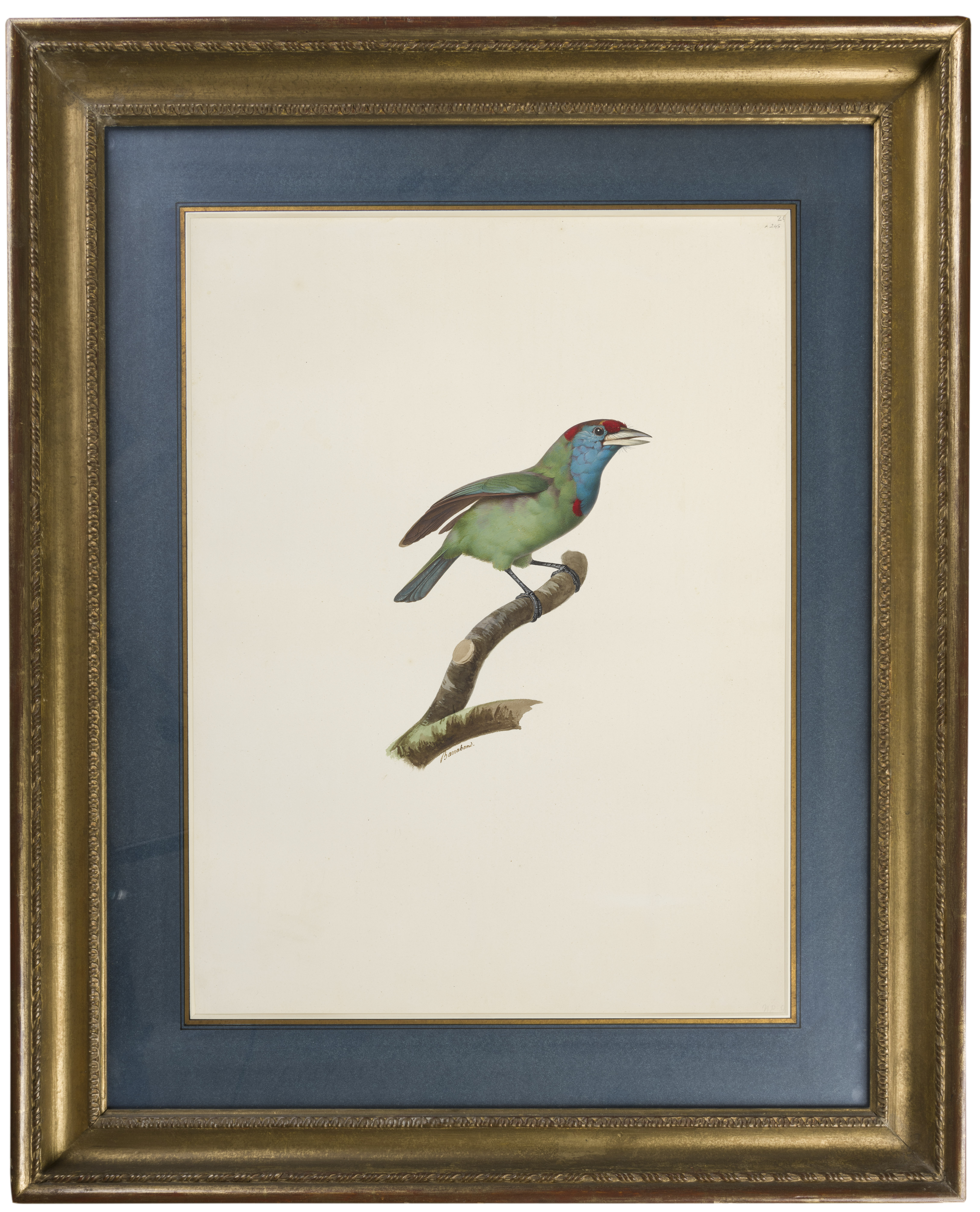 This large watercolour by Jacques Barraband is a preparatory study for one of the 197 engraved plates in François Levaillant’s two-volume 'Histoire naturelle des oiseaux de paradis et des rolliers, suivie des celle des toucans et des barbus', appearing in reverse in the published work. The drawing depicts the blue-throated barbet (Megalaima asiatica), a member of the Asian barbet family of birds native to Southeast Asia and the Indian subcontinent. Characterized by bright green, blue and red feathers, barbets get their name from the bristles which fringe their heavy bills.