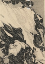 This is a preparatory study for one of Reynolds’s full-page illustrations – with the caption ‘The Blue Hare – ‘Where None Dare Follow.’’ - in Harry Mortimer Batten’s book Habits and Characters of British Wild Animals, published in 1920. The blue hare or mountain hare (lepus timidus) is found in mountainous and polar regions across northern Europe and Asia. It is the only hare native to Britain, and is indigenous to the Highlands of Scotland. While their fur is a bluish-grey in summer, mountain hares change their colour in winter, turning their pelage white to be better camouflaged against the snow. As Batten writes, ‘Two thousand feet is probably the topmost altitude of the brown hare’s range…Above that the territory is sacred to the blue. Blue hares…observe no fixed rule as to boundary. The heights are theirs undividedly, but they are quite at home in the valleys…The blue hare is nothing like so speedy, nor is it so resolute in flight, as is the brown. A good sheep-dog can run it down – often without any great resistance on the part of the hare…a blue hare will den up readily if hard pressed – seeking safety in a cranny among the rocks or in a disused rabbit-burrow.’