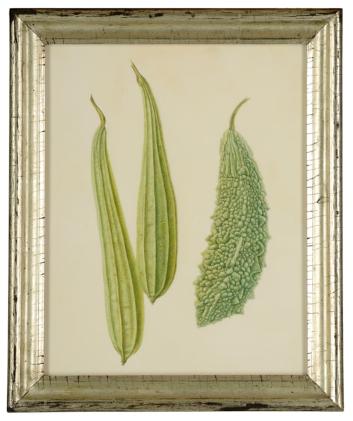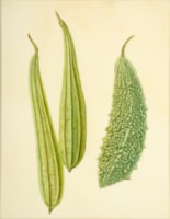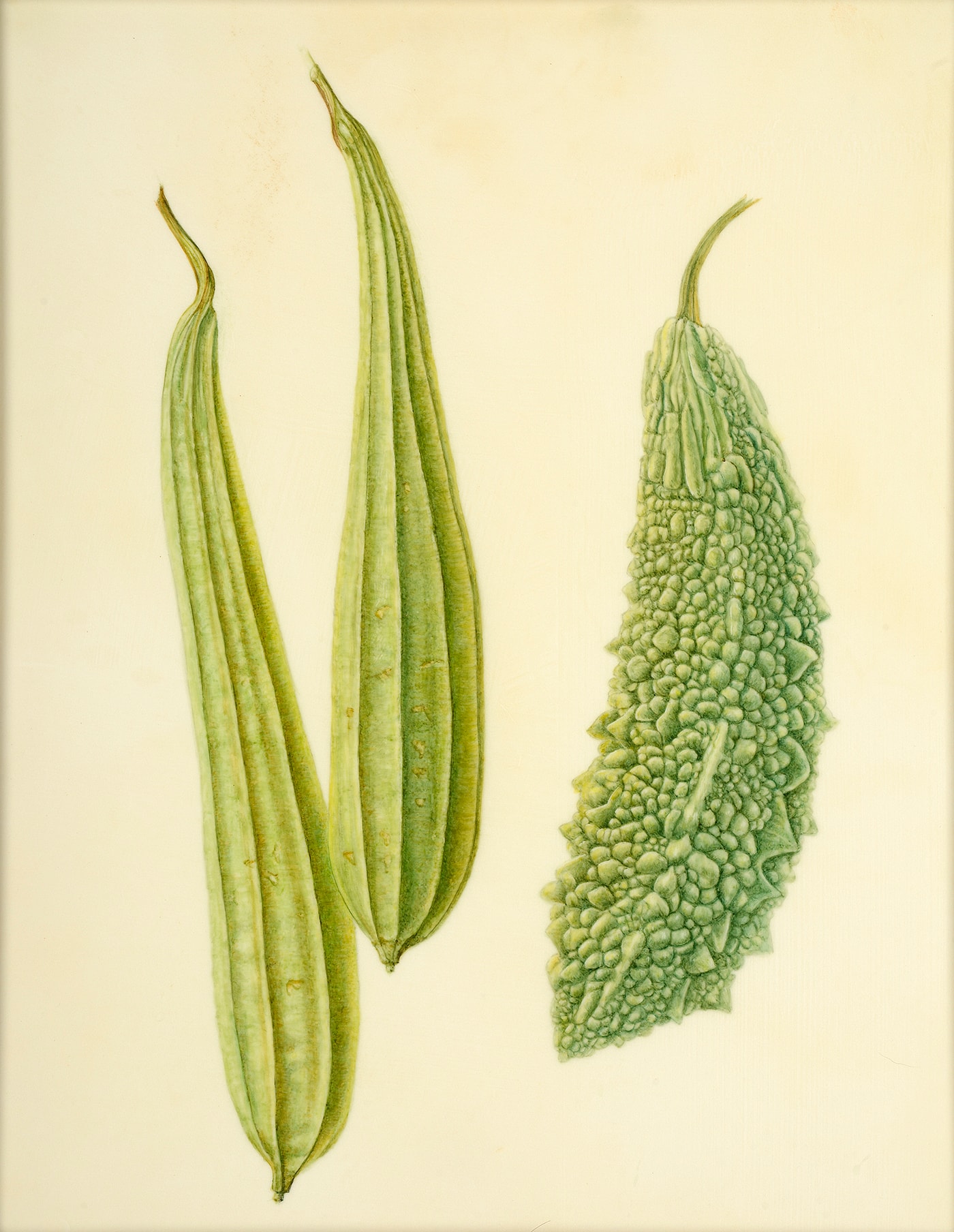 The present sheet was drawn in 2016, and depicts two ridge gourds at the left and a single bitter gourd at the right. Resembling a cucumber or zucchini with ridges, the ridge gourd (Luffa acutangula) is found throughout Asia. When unripe, its fruit is cultivated and eaten as a vegetable, particularly in China, India, and Vietnam, while when fully matured it can be harvested, dried and made into natural cleaning sponges or body scrubs. The bitter gourd (Momordica charantia), more commonly known as a bitter melon, is a tropical and subtropical vine grown throughout Asia, Africa and the Caribbean for its edible fruit, as well as for medicinal purposes. Of the several varieties of bitter gourd that are known, the fruit depicted in this drawing appears to be an Indian cultivar. Cooked when it is green or beginning to turn yellow, the bitter gourd is used extensively in the cuisine of the Indian subcontinent.