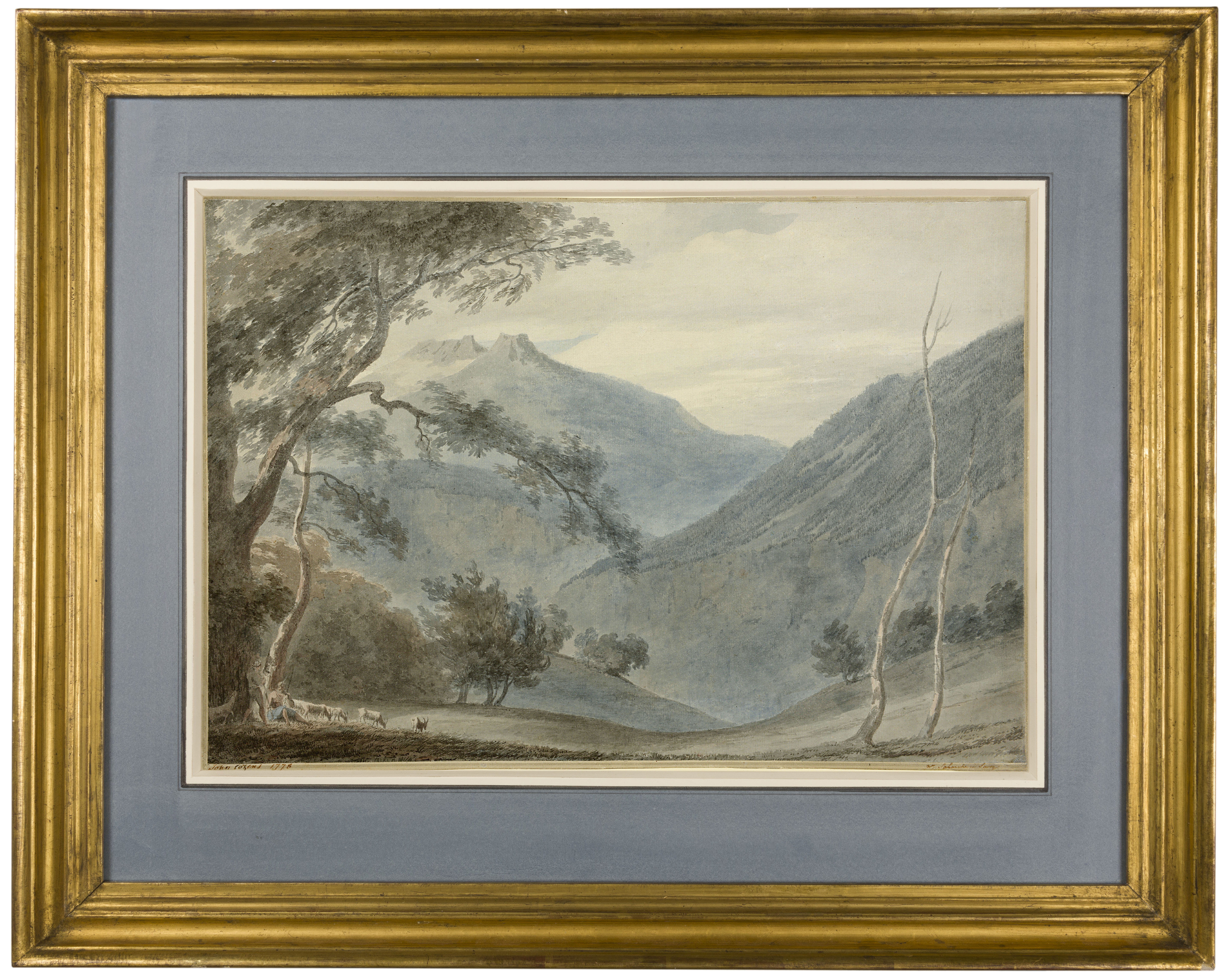 Worked up from the smaller, monochromatic Payne Knight drawing in the Whitworth Art Gallery, this large watercolour was drawn in 1778, during Cozens’s first stay in Rome. While the composition of both drawings is identical, the artist has added the shepherd and his flock at the lower left of the present sheet, while at the same time stripping the trees at the right of the foliage that appears in the earlier preparatory sketch. The mountain in the distance is likely to be the peak known as Tête de Colonney, above Sallanches to the northeast. Other views of the same area by Cozens include Bank of the Arve near Sallanches in Savoy and Between Sallanches and Servoz, Mont Blanc in the Distance, both recorded in pen and wash drawings in the collection of the British Museum.