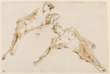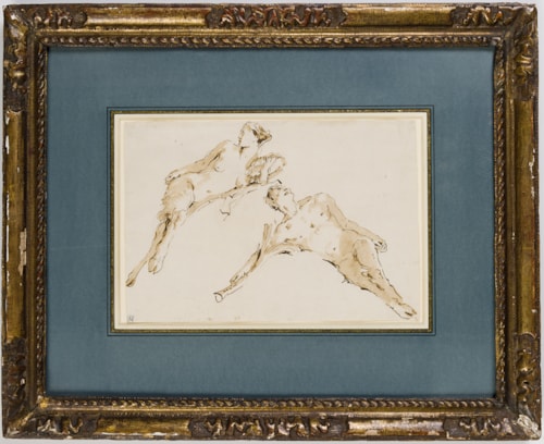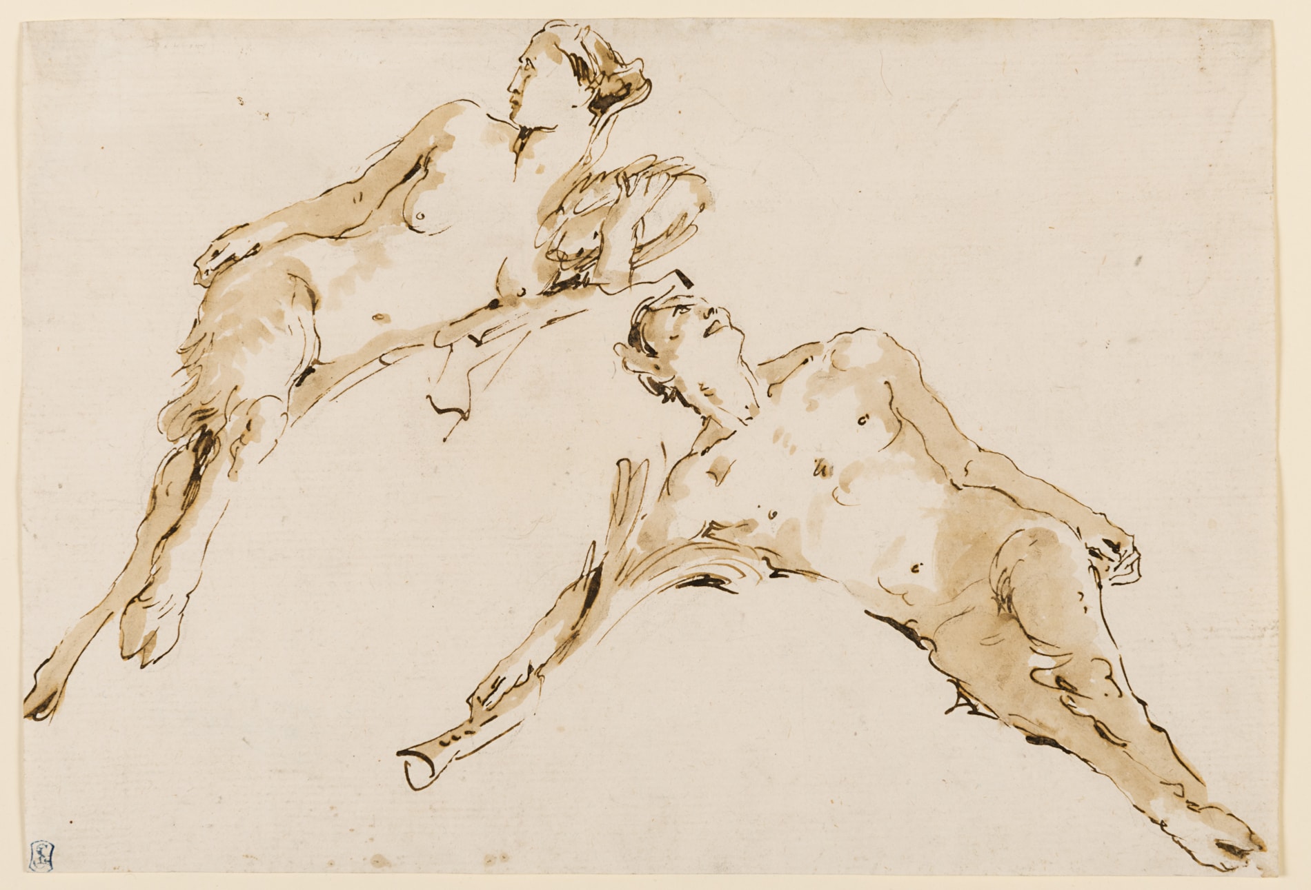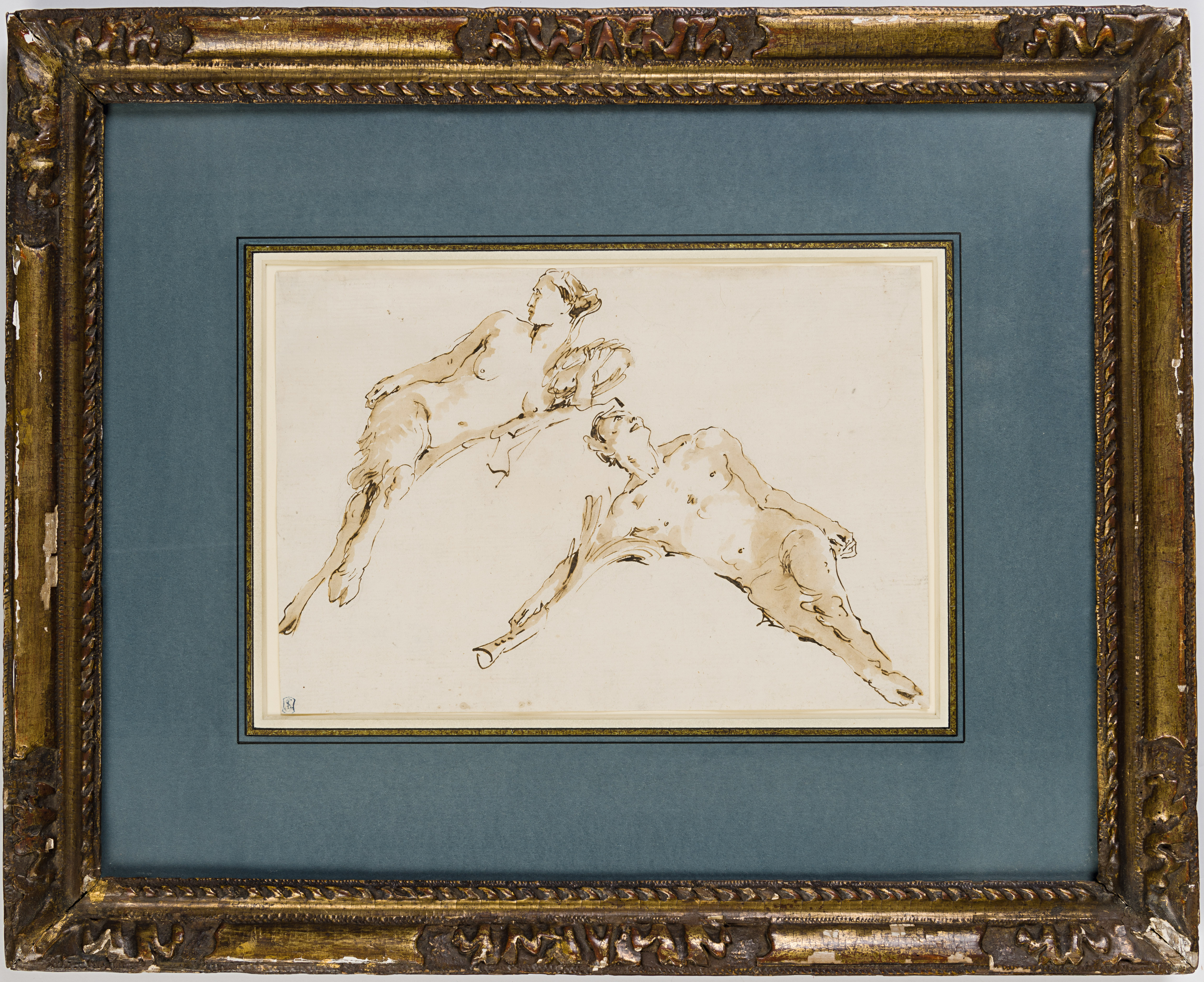 A group of fifteen pen and wash drawings of satyrs by Giambattista Tiepolo are in the collection of the Museo Horne in Florence; these include several studies of paired satyrs as depicted in the present sheet. Other drawings of satyrs by Tiepolo are today in the Metropolitan Museum of Art in New York, the Ecole des Beaux-Arts in Paris, the Pierpont Morgan Library in New York, the Fogg Art Museum in Cambridge, MA, and elsewhere. These drawings of satyrs were all part of the repertory of motifs that the artist began to assemble in the 1740s, both for the Palazzo Clerici frescoes and for future projects. Indeed, some of the satyrs in these drawings of the 1740s reappear in such later works as the decoration of the Ca’ Rezzonico in Venice, executed in 1756-1757, and the Villa Pisani at Strà, painted between 1760 and 1762.