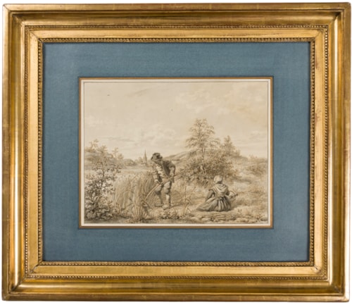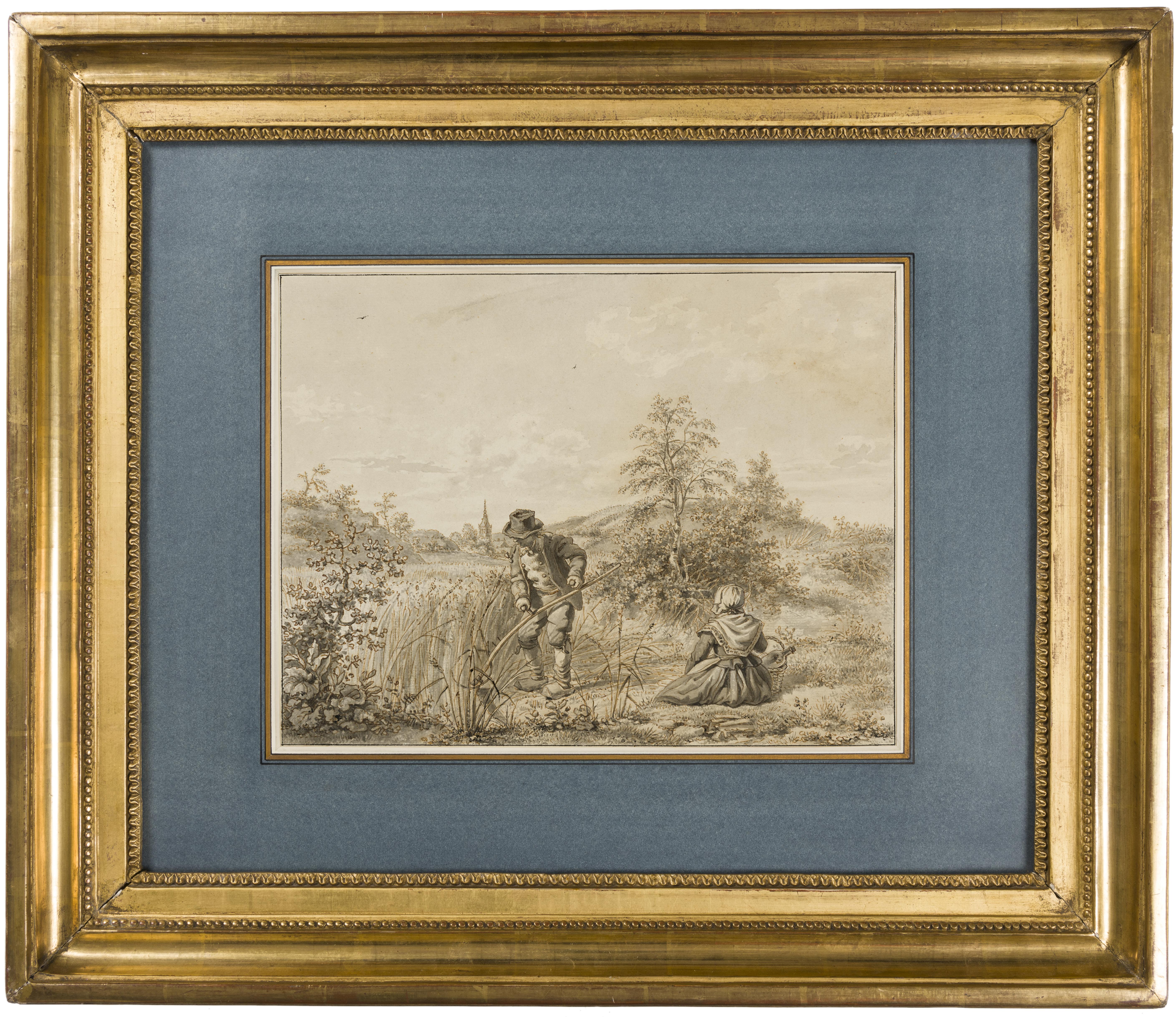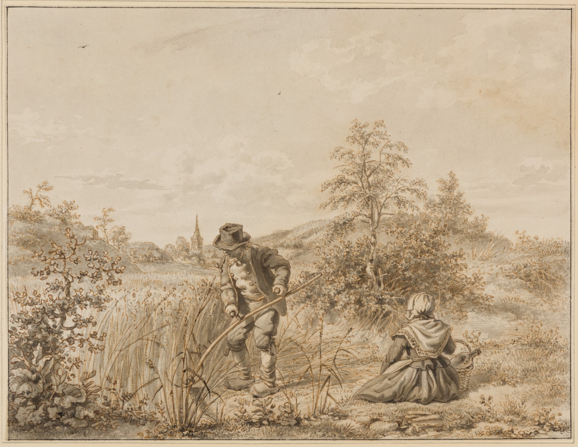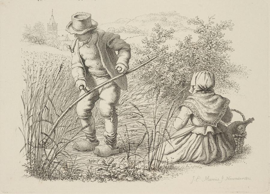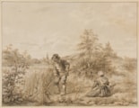 Jacob Marcus produced a closely related etching of a nearly identical subject of A Peasant Mowing Rye and a Resting Woman [see comparatve image], which repeats the central foreground portion of the present sheet. The undated etching measures 112 x 153 mm.