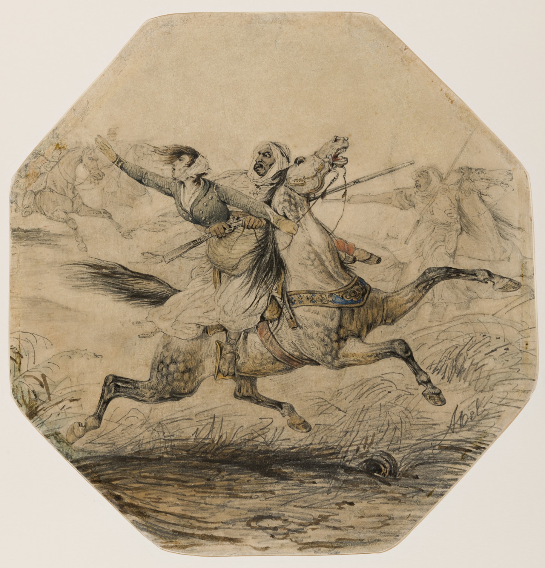 As the inscription on the former backing sheet notes, this drawing depicts the kidnapping of a vivandière named Hélène by an Arab horseman. The term vivandière was used to refer to camp-followers; women who accompanied the army into battle, serving mainly as cooks, laundresses and nurses.