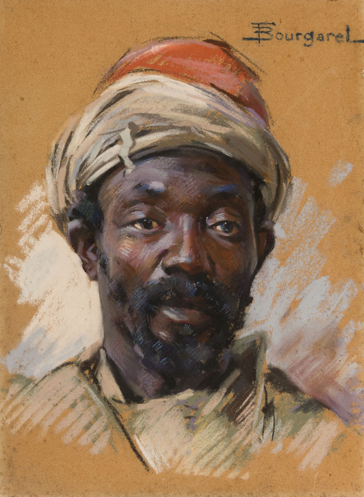 Nothing is known about the artist who executed and signed this striking head study in pastel and gouache. F. (or perhaps T?) Bourgarel does not appear in any biographical dictionaries, and was in all likelihood an amateur artist. The artist may have never exhibited his (or her?) work in public, which would further explain the lack of extant information associated with the name. The present sheet can approximately be dated to the late 19th century, and may have been drawn in one of the French colonies in North Africa.