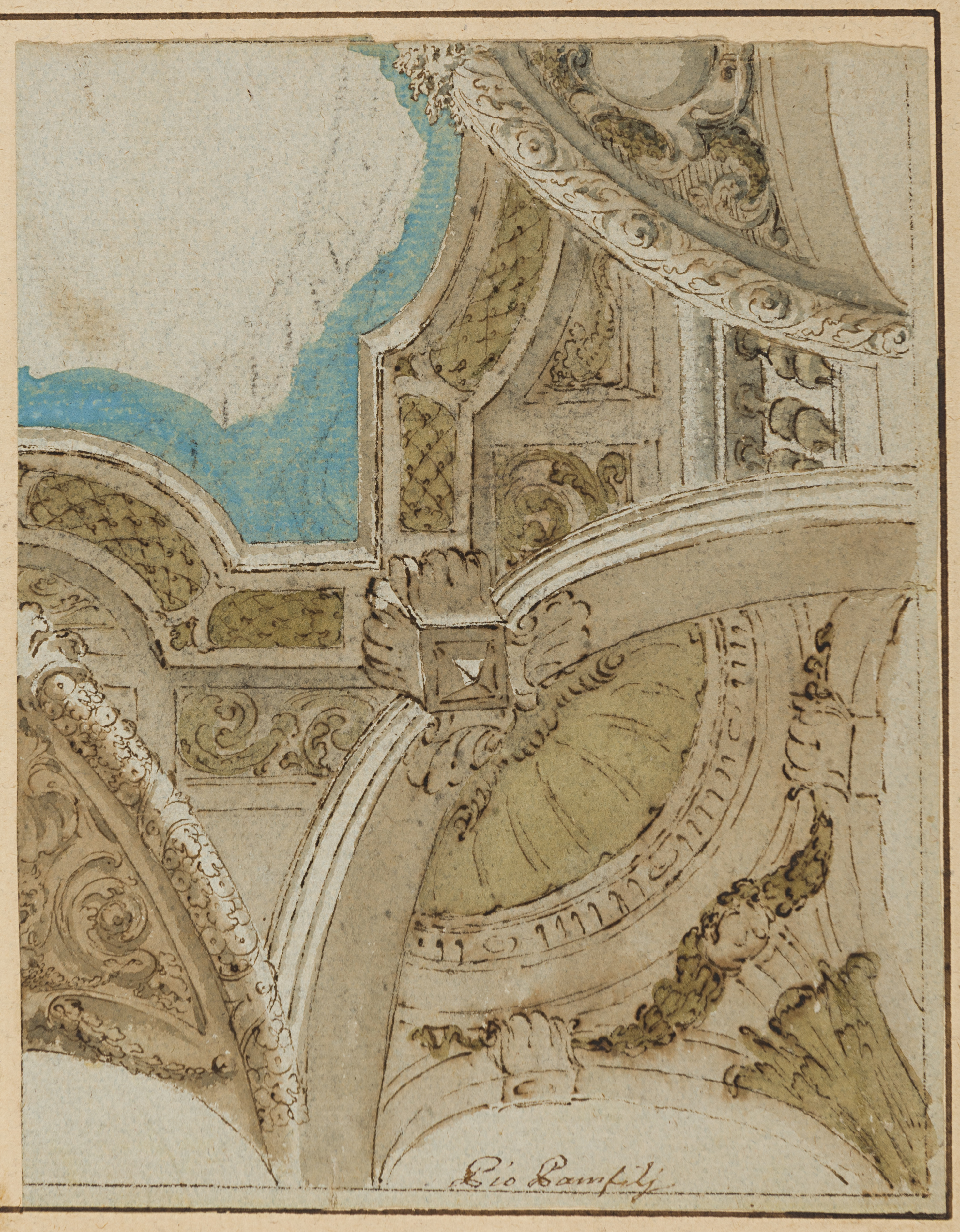 A stylistically comparable signed drawing of a ceiling design by Pio Panfili, in pen and brown ink and watercolour, was formerly in the collections of Alessandro Maggiori, Edmond Fatio and Lodewijk Houthakker. Also similar is a preparatory drawing for the ceiling of the Sala dell’Aquila in the Palazzo dei Priori in Fermo, signed and dated 1760, which was once in the collection of Richard Wunder, New York, and a drawing for part of the decoration of the cathedral of Fermo, in the Museo Civico d’Arte Industriale e Gallerie Davia Bargellini in Bologna.