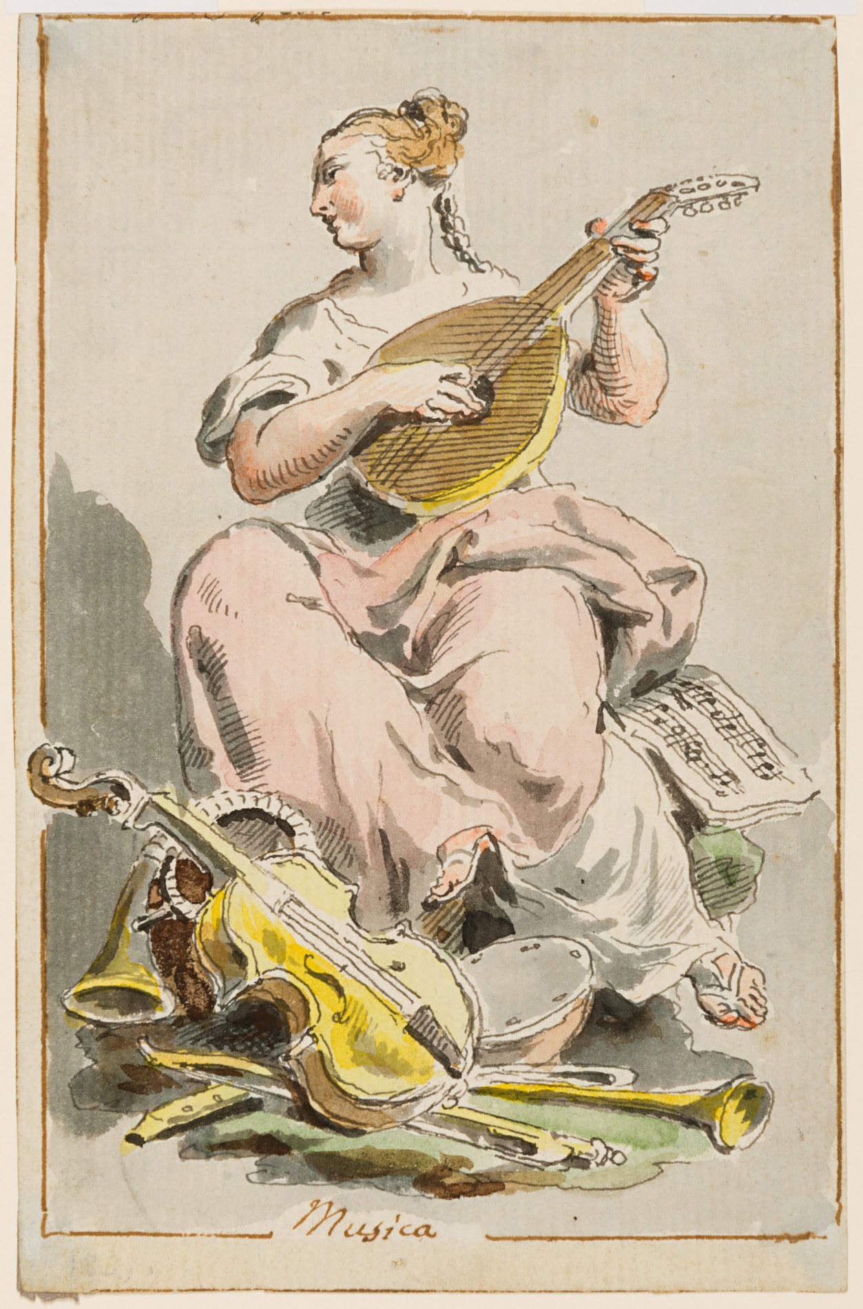 Among stylistically comparable drawings by Pietro de Angelis is a Design for a Ceiling Decoration with Ceres in her Chariot, signed ‘De Angelis Fecit’, which appeared at auction in New York in 1998, and a study of Venus and Paris, signed ‘Cav. Pietro de Angelis Romano F.’, sold at auction in Italy in 1974. An analogous drawing by the artist, albeit unsigned, depicting a musician crowned with a laurel wreath by a muse, is in the Kunsthalle in Bremen, while also similar in style and technique is an allegorical depiction of the River Arno, which was on the art market in Florence in 2013.