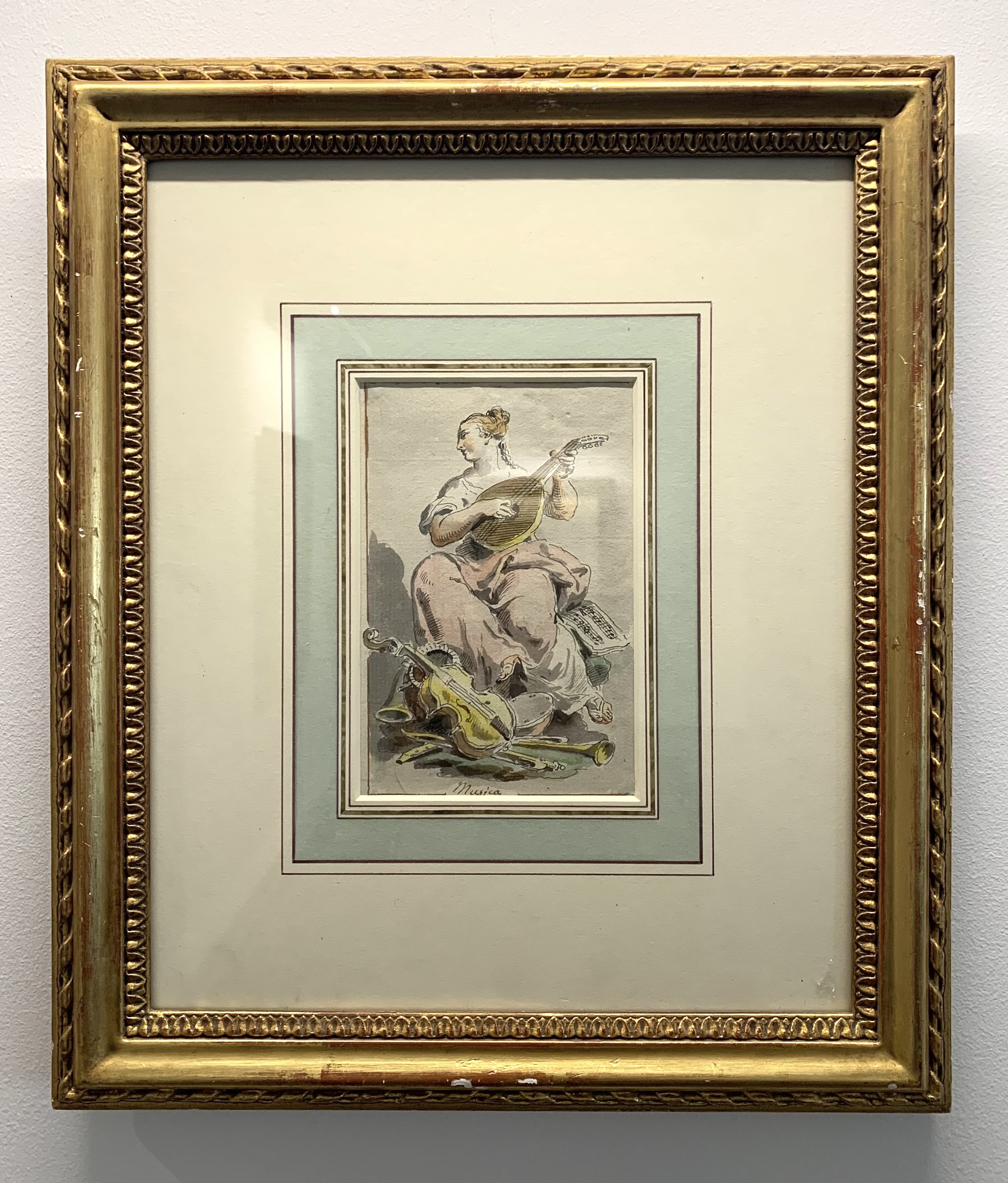 Among stylistically comparable drawings by Pietro de Angelis is a Design for a Ceiling Decoration with Ceres in her Chariot, signed ‘De Angelis Fecit’, which appeared at auction in New York in 1998, and a study of Venus and Paris, signed ‘Cav. Pietro de Angelis Romano F.’, sold at auction in Italy in 1974. An analogous drawing by the artist, albeit unsigned, depicting a musician crowned with a laurel wreath by a muse, is in the Kunsthalle in Bremen, while also similar in style and technique is an allegorical depiction of the River Arno, which was on the art market in Florence in 2013.