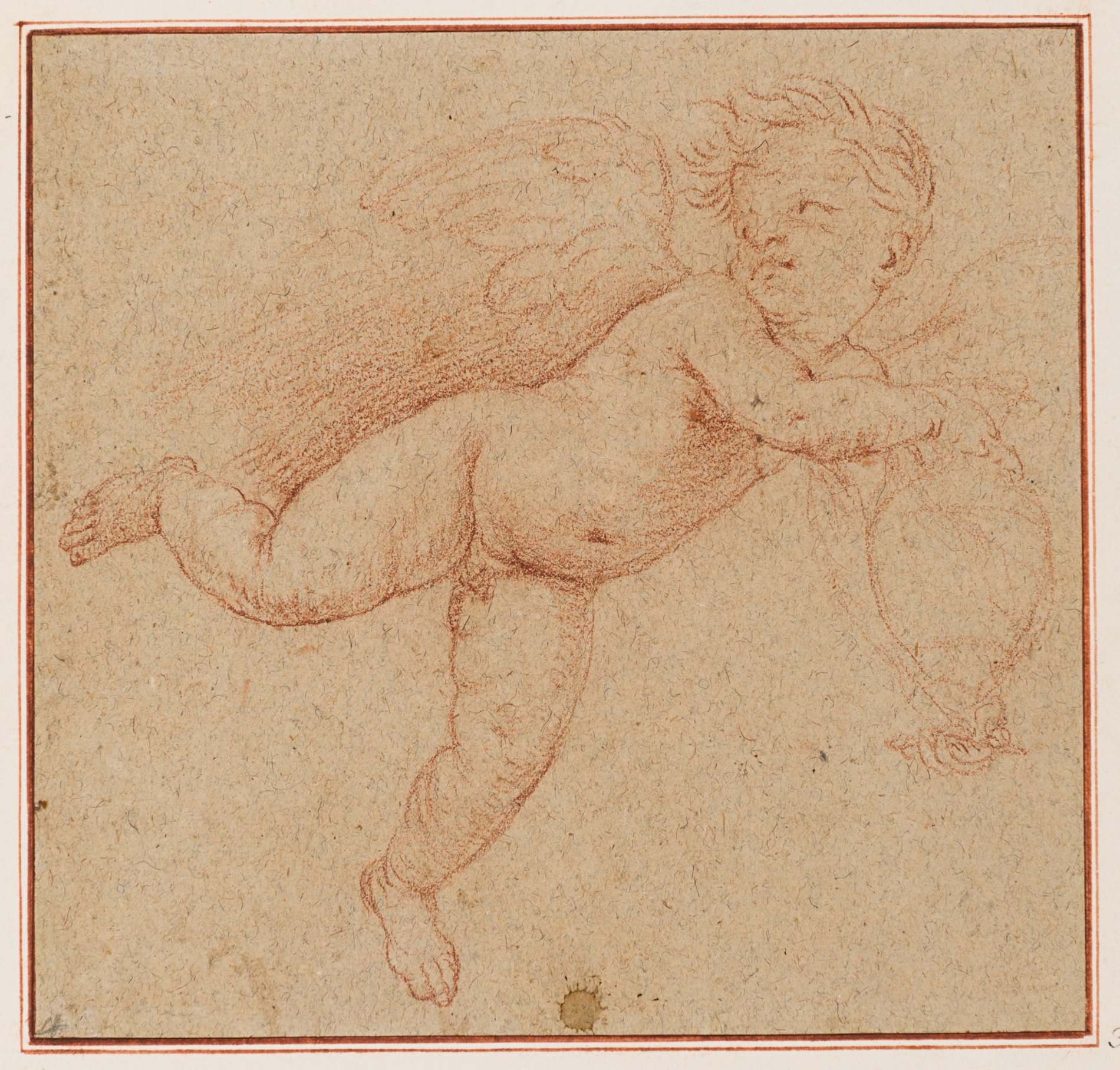This fine drawing would appear to be by a Bolognese artist in the circle of the painters Simone Cantarini (1612-1648) or Flaminio Torri (1621-1661). A painter, draughtsman and printmaker, Cantarini studied with Guido Reni in Bologna and worked there and in Rome, Pesaro and Verona. He was highly praised by the Bolognese art historian and biographer Carlo Cesare Malvasia, who noted, however, that he was jealous of other artists and often argued with his patrons. Of his drawings in particular, Malvasia wrote that ‘there has been no more graceful and delightful draughtsman since the days of Parmigianino’, and many of Cantarini’s drawings – which are almost always executed in red chalk - were acquired by contemporary collectors. Although he was an avid and productive draughtsman, only a few drawings by Cantarini can be related to paintings or etchings by him.