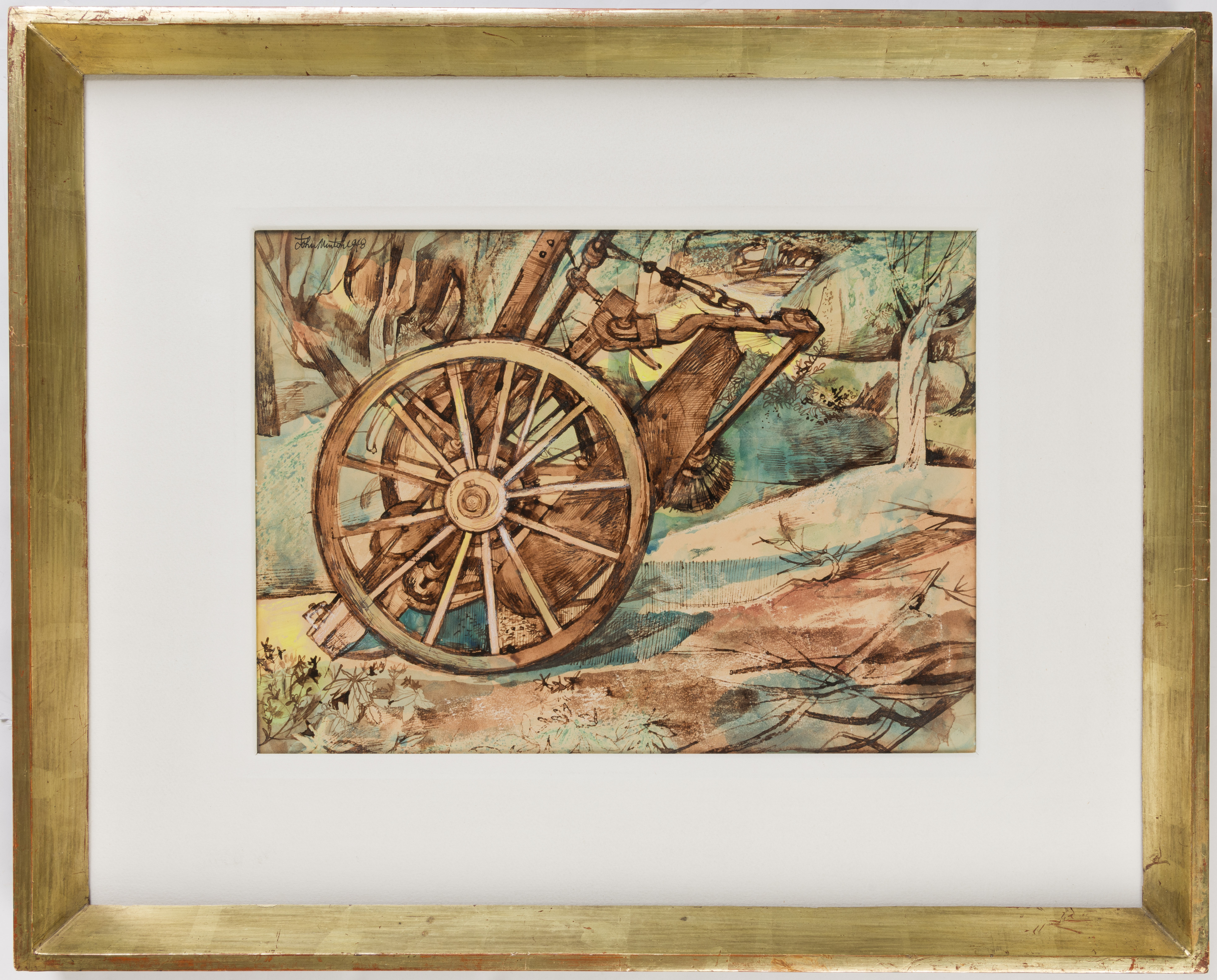 Many of Minton’s drawings and watercolours of the late 1940s depict farms and record farming practices that were soon to be mechanized. This large sheet can be associated with a handful of watercolours by Minton of pieces of farm machinery that were no longer in use, all dating from 1948 and of similar dimensions. A comparable watercolour of Derelict Farm Machinery, signed and dated 1948, was with Stephen Ongpin Fine Art in 2015 and is today in the collection of the Huntington Library, Art Collections, and Botanical Gardens in San Marino, California. Among several other studies of farm machinery by Minton is a watercolour of a Farm Machine, of similar dimensions to the present sheet, which was on the London art market in 20064. A related drawing of Farm Machinery from 1948, also similar in scale, was in the Oliver Brown collection, and another of a Derelict Farm Machine was, like all of these drawings, at one time with the Lefevre Gallery in London.