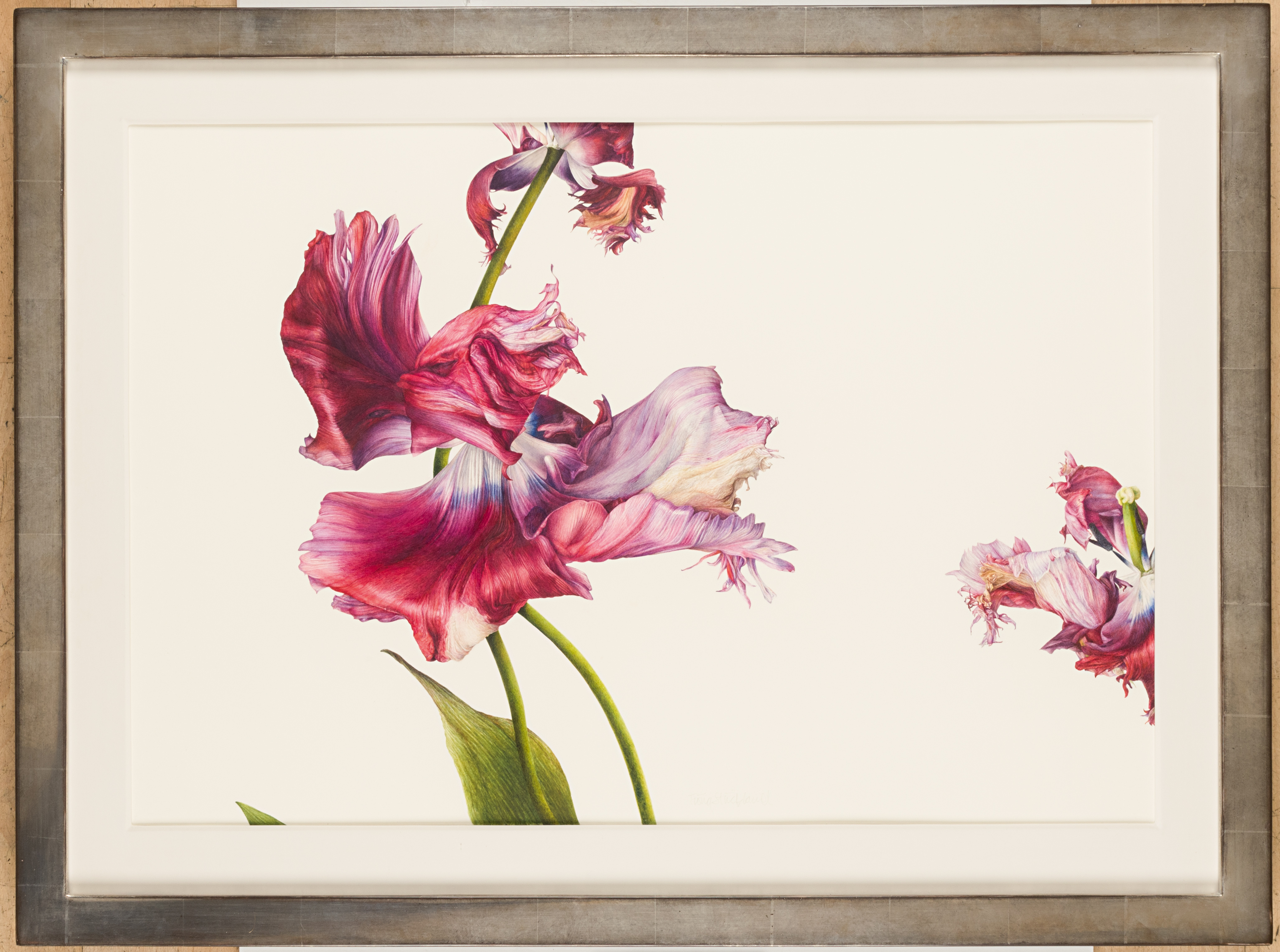 As noted in the catalogue of a recent exhibition of the artist’s small-scale watercolours on vellum, ‘Fiona Strickland has long been drawn to tulips, finding their colour, shape, and form visually engaging, and the history of their depiction in art intellectually fascinating…she follows in the footsteps of illustrious artistic forebears, including the painters of the Dutch Golden Age such as Ambrosius Bosschaert, Balthasar van der Ast, and Jacob Marrel, whose seventeenth-century Tulip Book she travelled to study at close-hand in the Rijksmuseum in 2016…Often depicting flowers from an unusual viewpoint or at turning points in their life cycle, her paintings act as portraits of individual flowers, rather than scientific representations of a species.’ Strickland is a member of the Wakefield and North of England Tulip Society, founded in the early 19th century, and often paints individual tulips from the society’s annual shows.