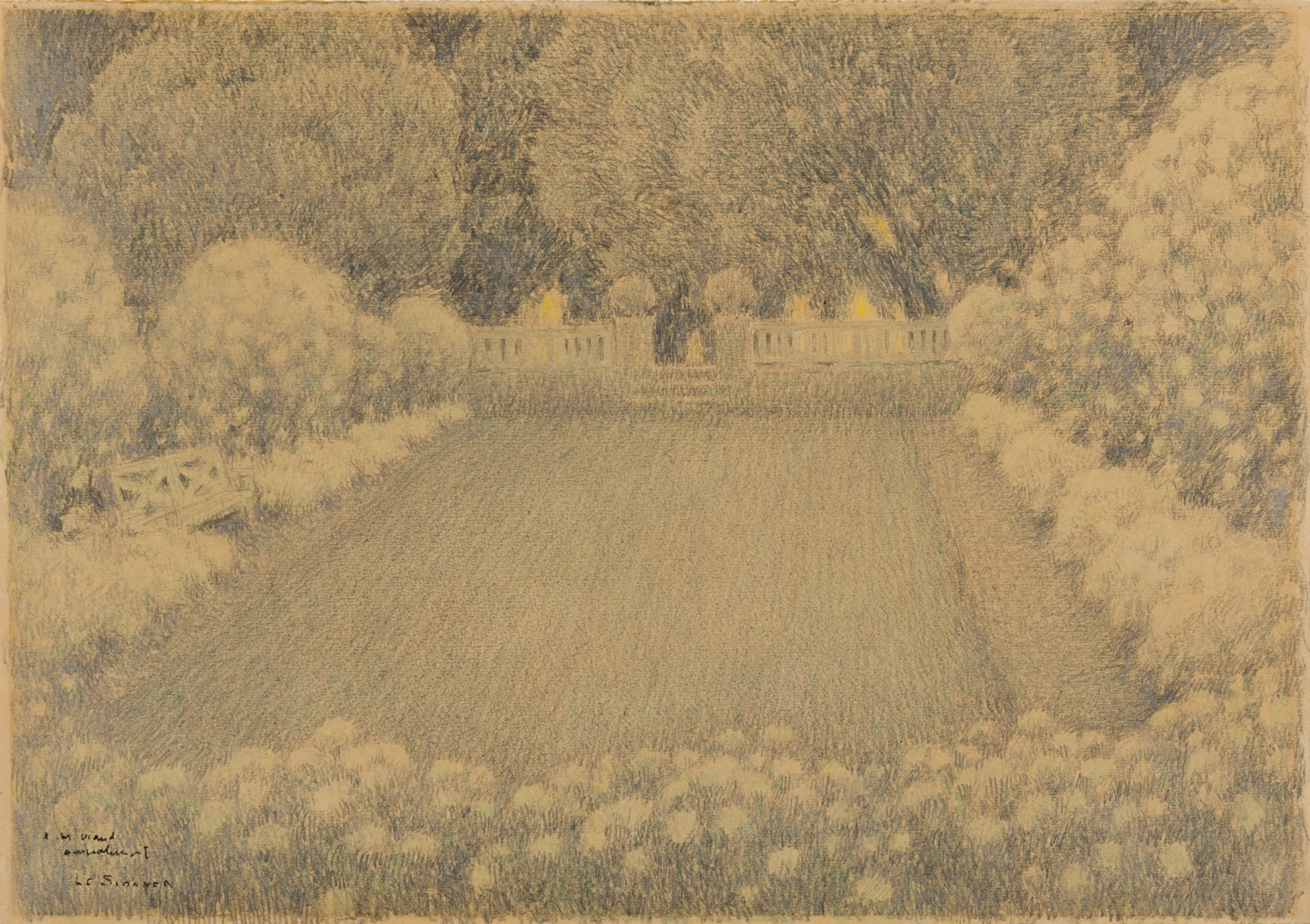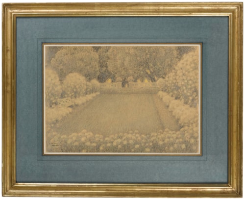 This drawing is a finished preparatory study for Le Sidaner’s large painting Le jardin blanc au crépuscule of 1912, which was acquired, the year after it was painted, by the Musées Royaux des Beaux-Arts de Belgique in Brussels. The painting depicts the so-called white garden, decorated with white flowers, that was created by the artist soon after he acquired the property at Gerberoy: ‘At the top of the four steps facing the house…Le Sidaner designed a white garden in which a small, rectangular lawn, lined with gravel paths, was surrounded by weeping rose tries and carnations. The enclosed, fragrant terrace was especially beguiling at twilight…The glory of the white garden was to be fleeting; the rose trees were decimated in the harsh winter of 1917 and replaced by hardier species with longer blooming periods.’ Also preparatory for the Brussels painting is a slightly larger oil sketch on panel of the same composition, which was in a private collection in 1989.