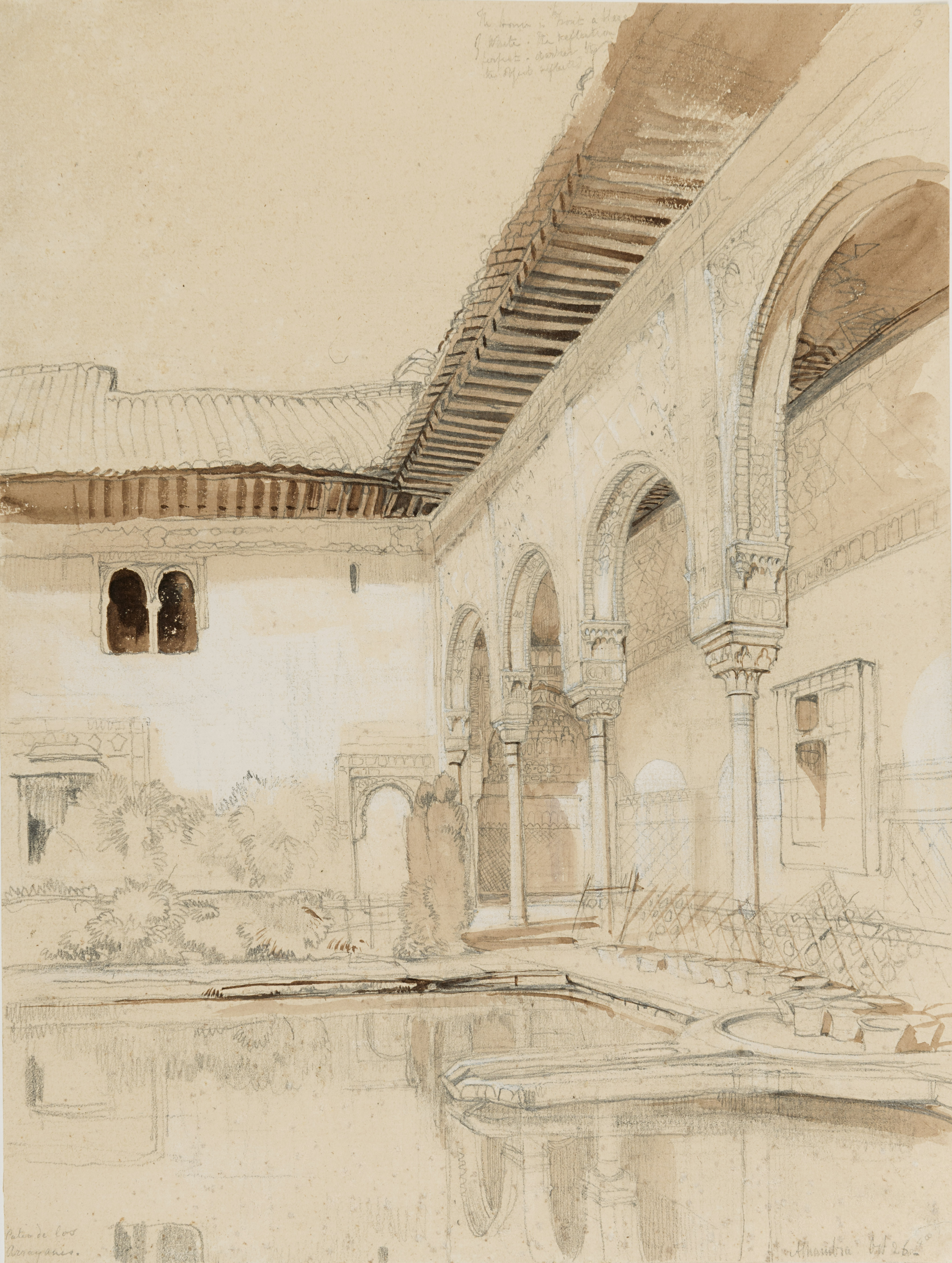 Lewis’s Alhambra drawings have long been recognized as among the finest works of his Spanish period. As the artist’s grand-nephew noted, ‘Lewis’s sketches of the Alhambra…are important as being his first sustained attempt at architectural drawing. Furthermore, in the Alhambra he was close to the fascinating relics of an Islamic culture for the first time. Lewis was captivated by it all: the elegance of this palace made for indolent enjoyment; the traceries of its peristyles; the latticed jalousies through which some dark-eyed princess might observe unseen; the cool halls and the tinkle of water everywhere.’