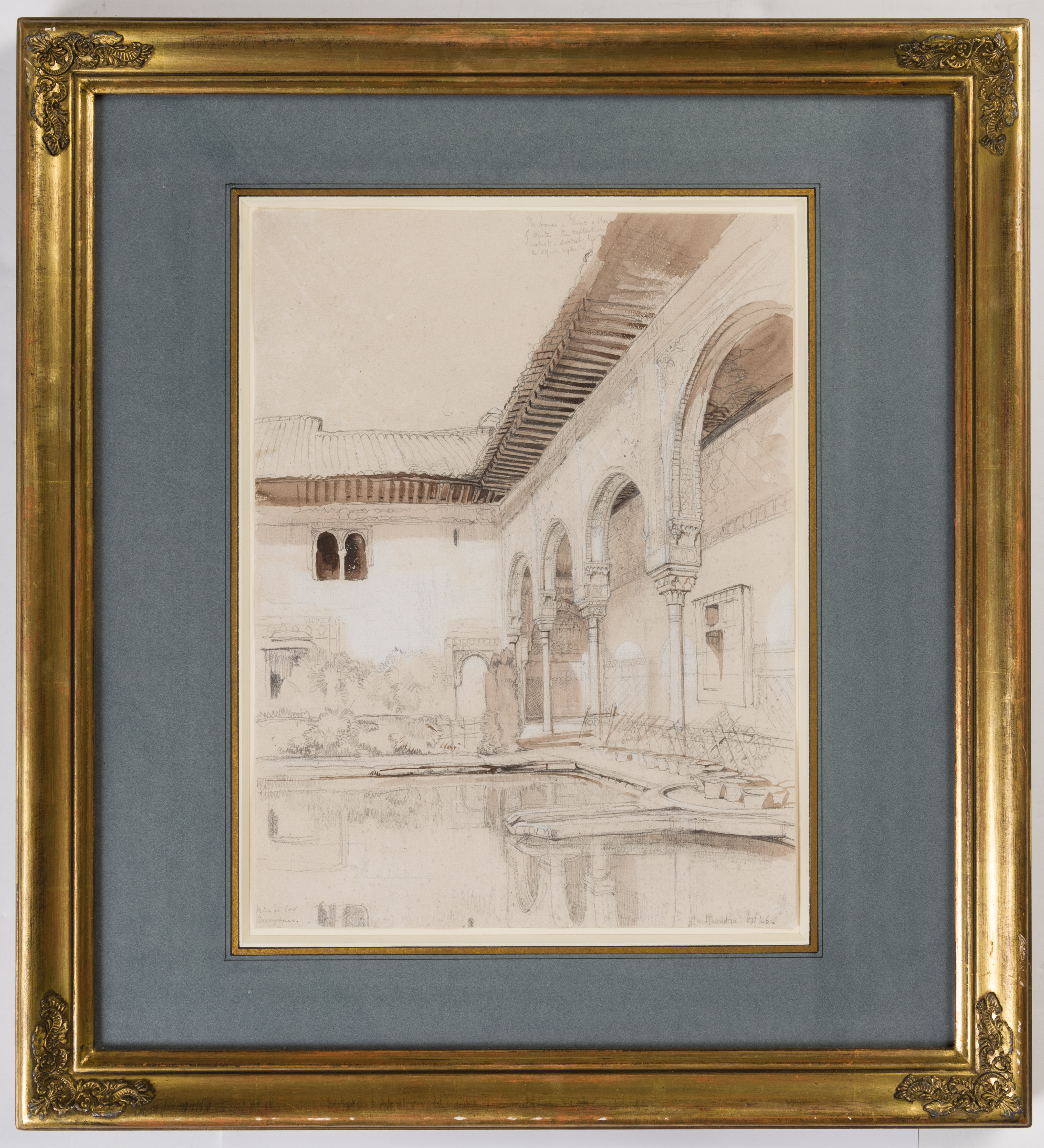 The present sheet, drawn on the 26th of October 1832, depicts the interior courtyard known as the Patio de los Arrayanes, or Courtyard of the Myrtles, so named for the myrtle bushes that border the central pond, which is fed by fountains at either end. Almost certainly made on the spot, this is very much a working drawing, and includes the artist’s colour notes in pencil.