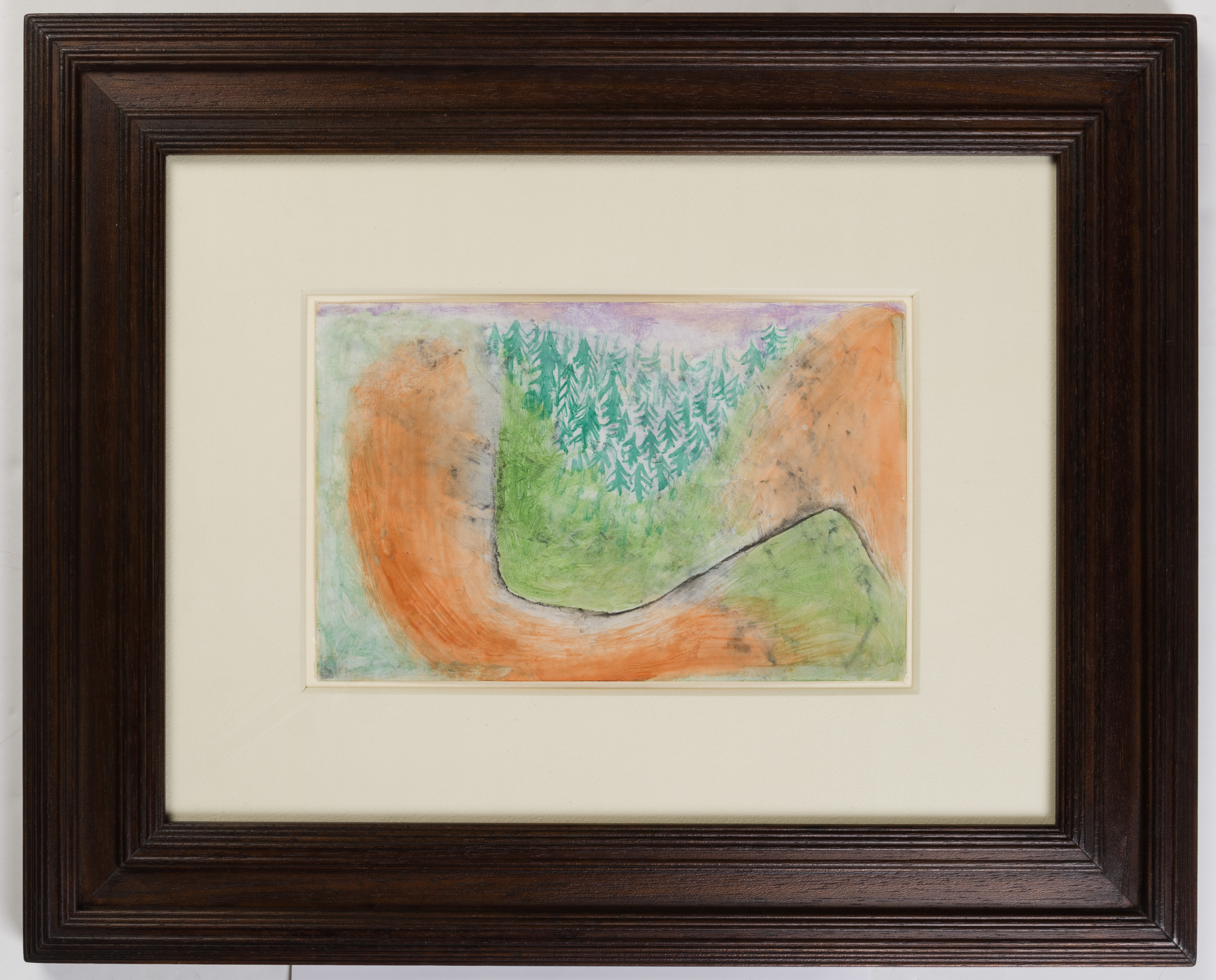 Previously known only from a black-and-white photograph, this vibrant oil sketch on paper of 1937 depicts an Alpine landscape with pine trees, and recalls the time that the artist spent in spas and health clinics in the Swiss mountains during the previous months. Although drawn the same year that Klee was being publicly disparaged in Nazi propaganda, with his work shown at the Entartente Kunst exhibition and his paintings removed from museum collections, the present sheet displays no trace of any reference to this tumultuous period near the end of the artist’s life. Klee’s characteristic serpentine line, dividing the composition and directing the viewer’s eye to the cluster of pine trees at the top, and the use of complimentary pastel colours, serve to highlight the artist’s ever-present imagination and his undying sense of optimism.