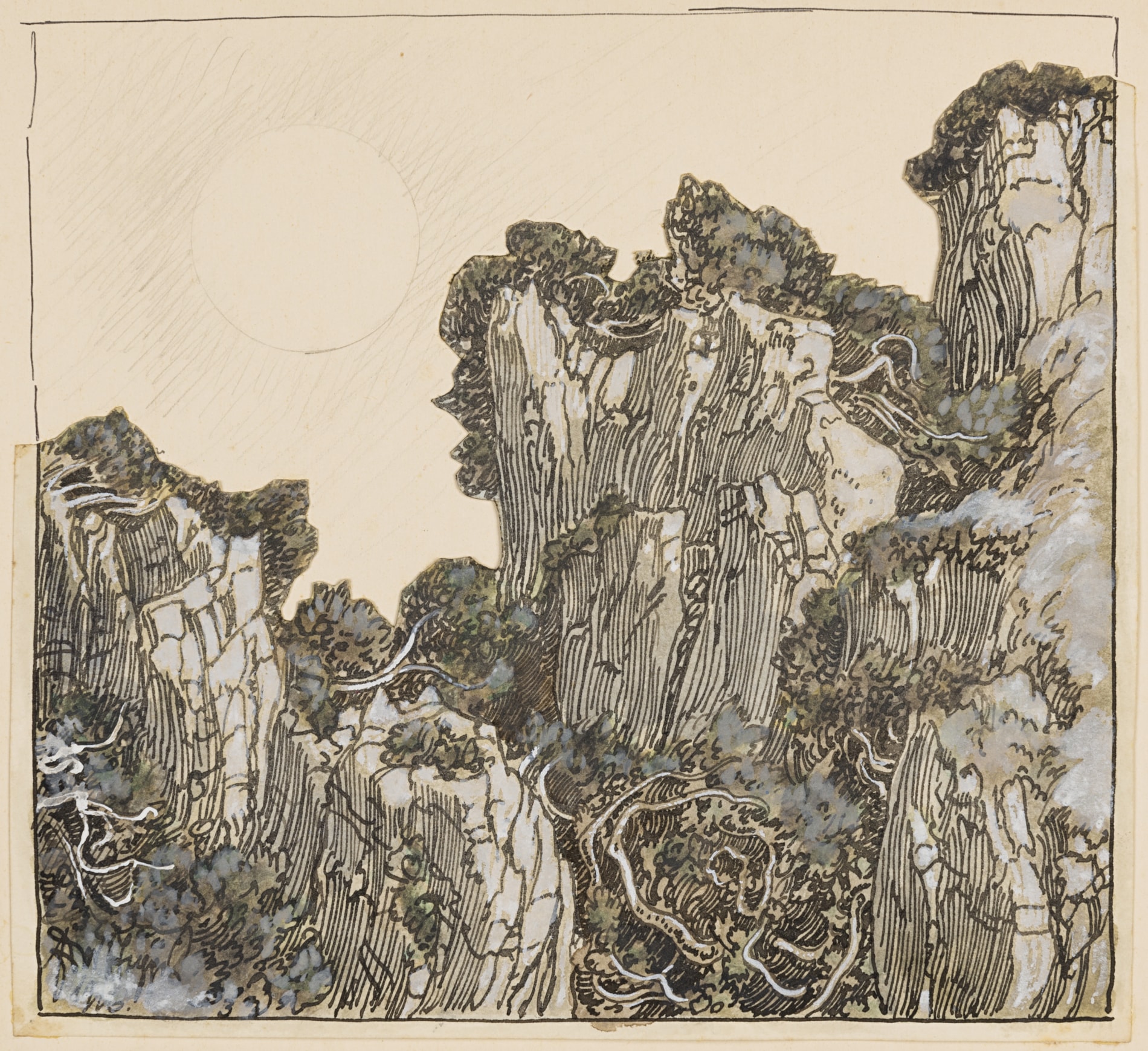 Pen and black ink and brown and grey wash, with white and grey gouache.