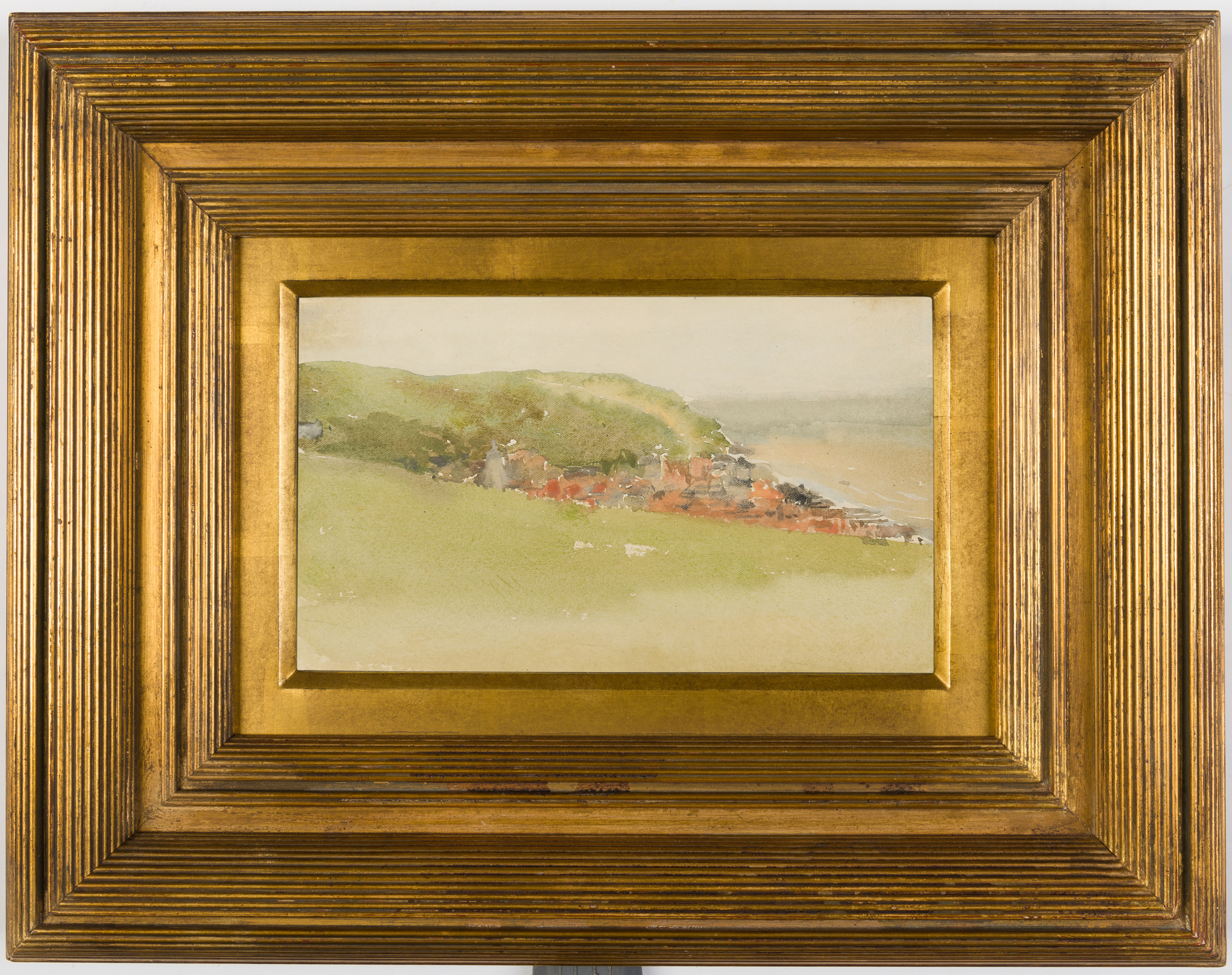 This small, fresh watercolour depicts the cliffs above the coastal town of Hastings, in East Sussex. In the summer of 1875, Whistler’s brother William had persuaded their elderly mother, for reasons of her health, to leave the artist’s home and studio in Lindsey Row in Chelsea, where she had been living, and move to the Sussex coast. Aged seventy and prone to bouts of severe bronchitis aggravated by London’s smoky air, Anna McNeill Whistler ‘took a suite of rooms at 43 St. Mary’s Terrace, high on a hill above the seaside town of Hastings, on England’s southern coast. By September, she was strong enough to stroll along the hillside…At night, she could see the lights of the town from the bow window of her sitting room, although she most enjoyed watching, as her artist son would have done, the “moonlight shining on the sea beyond”.’