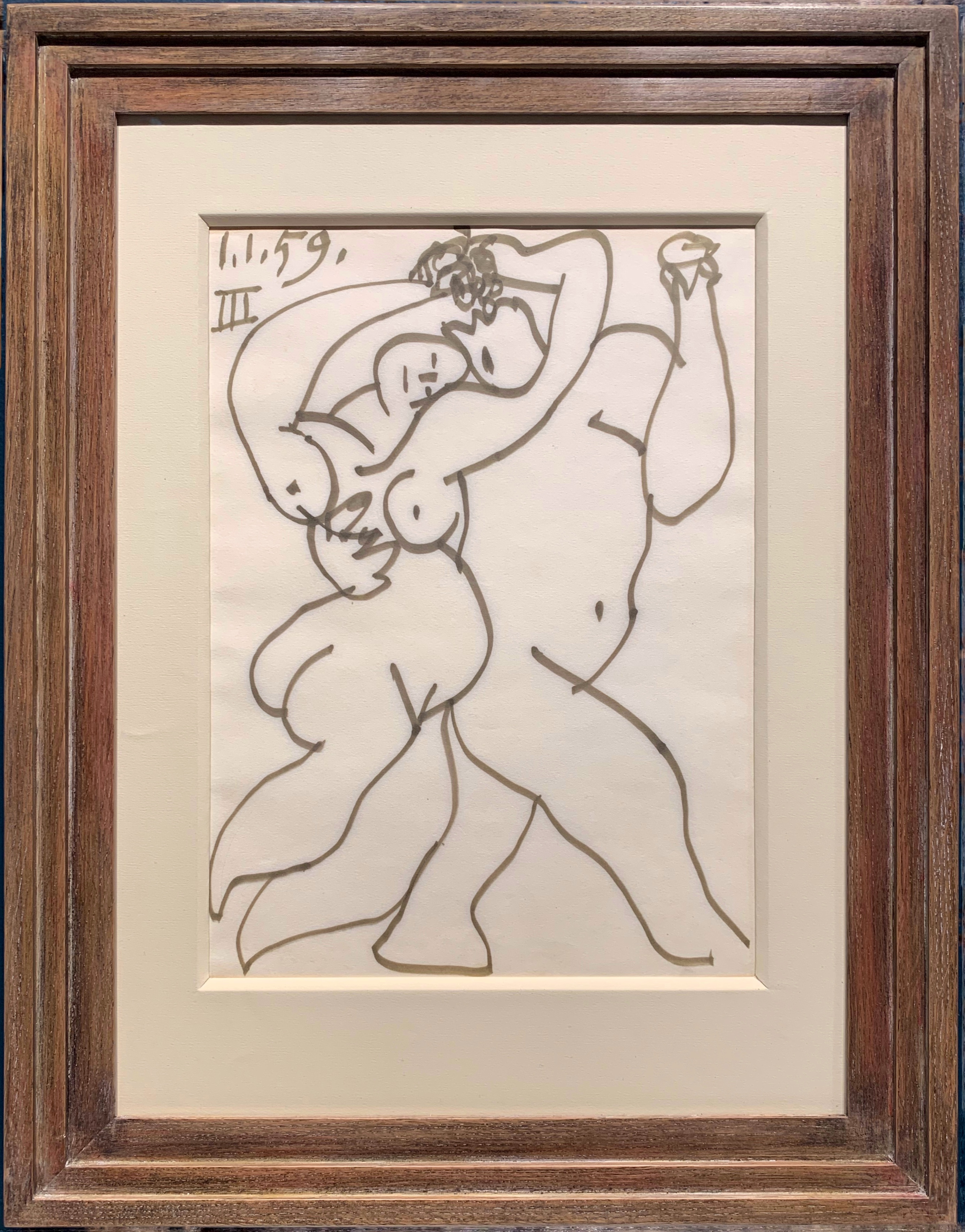Drawn on the 1st of January 1959, this large sheet was Picasso’s third drawing of the New Year. The previous drawing executed by the artist that day was a closely related composition of a dancing or embracing couple, and shared the same provenance as the present sheet until it was sold at auction in 2017. Both drawings come from one of the few late sketchbooks by Picasso. While the last two decades of his career were a time of great productivity for Picasso, not many sketchbooks are known from this fecund period. With the exception of 1962, when the artist filled eight sketchbooks with drawings inspired by Edouard Manet’s Le Déjeuner sur l’herbe and Jacques-Louis David’s Rape of the Sabines, only eight other sketchbooks are known from the final decade and a half of his career, before his last known carnet of 1967. As Léal has written of Picasso’s late sketchbooks, ‘The carnets are no longer places for preparatory studies for the paintings, which they accompany rather than precede, but supports for exercises combining relaxation…and discipline…, dominated by the theme of the nude, a pretext for variations on the arabesque, which appears clearly, through these final notebooks, as the formal link connecting him to the heritage of Delacroix, Ingres and Manet.’