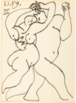 Drawn on the 1st of January 1959, this large sheet was Picasso’s third drawing of the New Year. The previous drawing executed by the artist that day was a closely related composition of a dancing or embracing couple, and shared the same provenance as the present sheet until it was sold at auction in 2017. Both drawings come from one of the few late sketchbooks by Picasso. While the last two decades of his career were a time of great productivity for Picasso, not many sketchbooks are known from this fecund period. With the exception of 1962, when the artist filled eight sketchbooks with drawings inspired by Edouard Manet’s Le Déjeuner sur l’herbe and Jacques-Louis David’s Rape of the Sabines, only eight other sketchbooks are known from the final decade and a half of his career, before his last known carnet of 1967. As Léal has written of Picasso’s late sketchbooks, ‘The carnets are no longer places for preparatory studies for the paintings, which they accompany rather than precede, but supports for exercises combining relaxation…and discipline…, dominated by the theme of the nude, a pretext for variations on the arabesque, which appears clearly, through these final notebooks, as the formal link connecting him to the heritage of Delacroix, Ingres and Manet.’