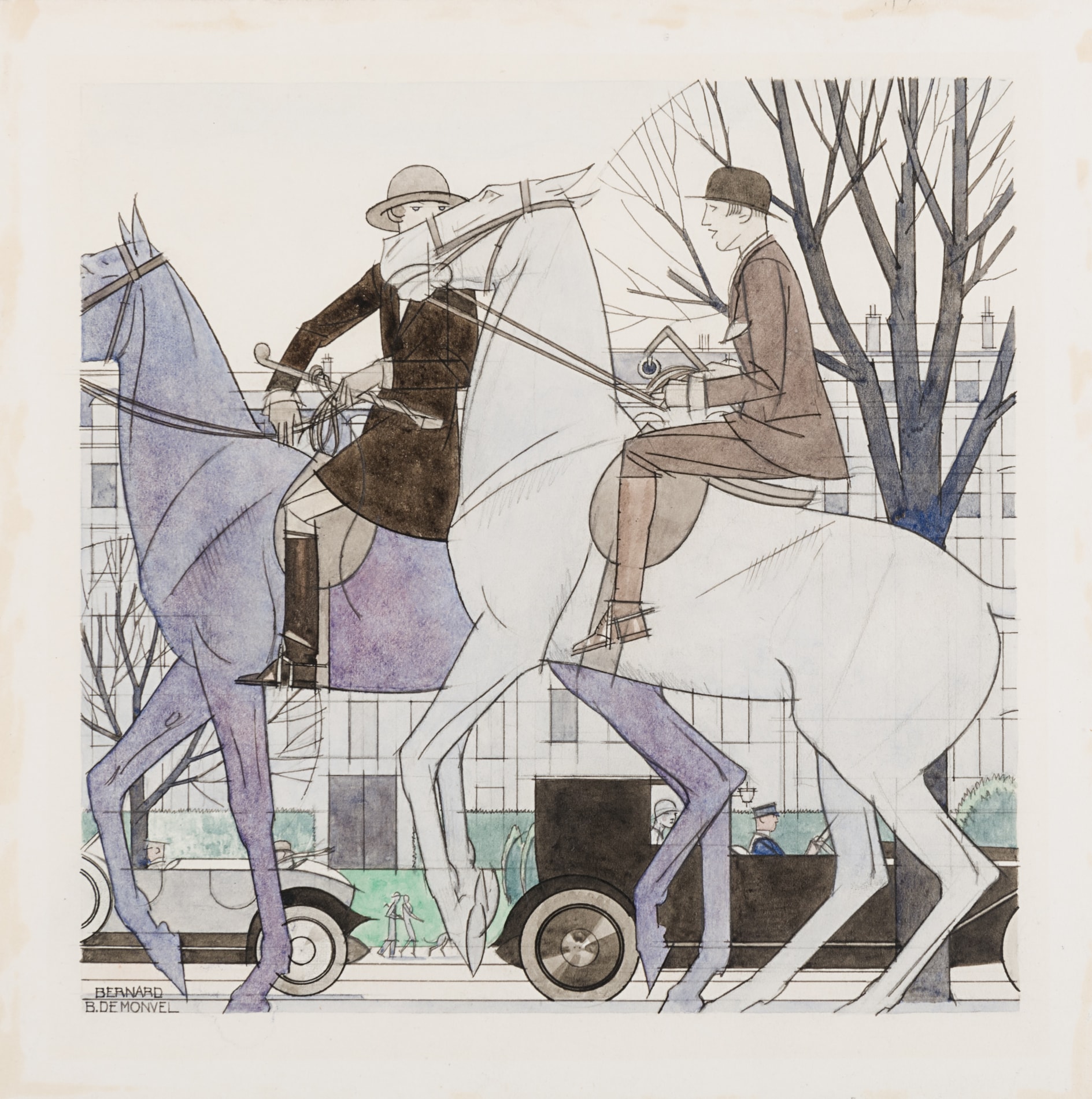 Although he is perhaps best known as a painter of decorative panels and portraits, as well as urban views, Boutet de Monvel also produced book and fashion illustrations for such magazines as the Gazette du Bon Ton, La Vie Parisienne, Fémina, Le Journal des Dames et de Modes (Costumes parisiennes) and Le Rire. He provided drawings for Harper’s Bazaar in the 1920s and 1930s, and contributed illustrations to the first French edition of Vogue, published in June 1920, for which he continued to illustrate the latest fashions. Boutet de Monvel was himself a well-known dandy, known for his innate style and elegant dress sense. A frequent exhibitor at the Salons in Paris, showing portraits, landscapes and nudes, Boutet de Monvel died in a plane crash near the Azores in 1949. Works by Boutet de Monvel are today in the collections of the Musée des Arts Décoratifs, the Bibliothèque Nationale and the Musée National d’Art Moderne in Paris, as well as the Metropolitan Museum of Art in New York.