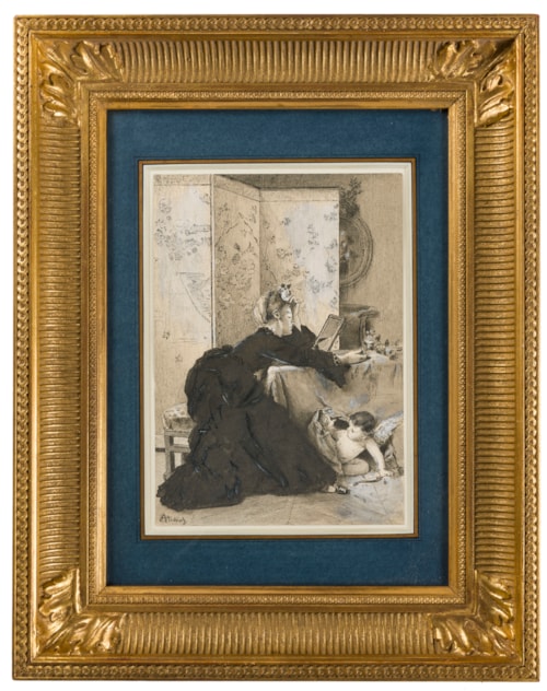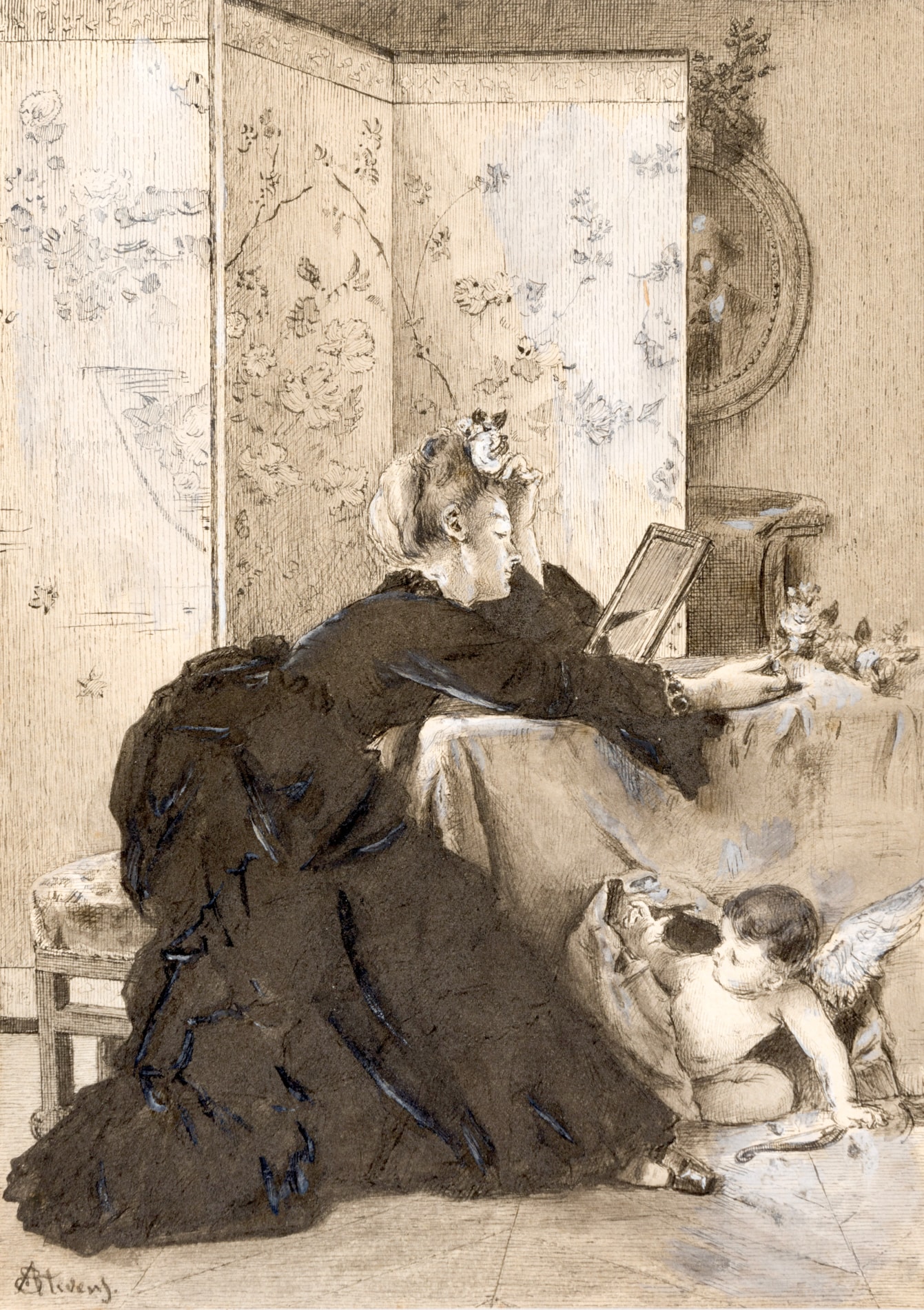 The present sheet is related to Alfred Stevens’ painting The Young Widow (La jeune veuve) of c.1873-1874, today in the Musée Royal de Mariemont in Morlanwelz, south of Brussels. The painting was purchased in April 1875 from the Brussels art dealer Henry Le Roy et fils by the Belgian collector Arthur Warocqué (1835-1880), whose widow later presented it to the museum. As Peter Mitchell describes the subject, ‘The young widow in black, with the portrait of the lost husband in the background, looks in the mirror to reassure herself that she is still attractive and able to attract a new admirer. She need have no worries because the promise of new love is assured by the well-timed appearance of Cupid from under the table.’ In his monograph on Stevens, published in 1906, Camille Lemonnier described The Young Widow as having ‘the charming caprice of a Fragonard’.