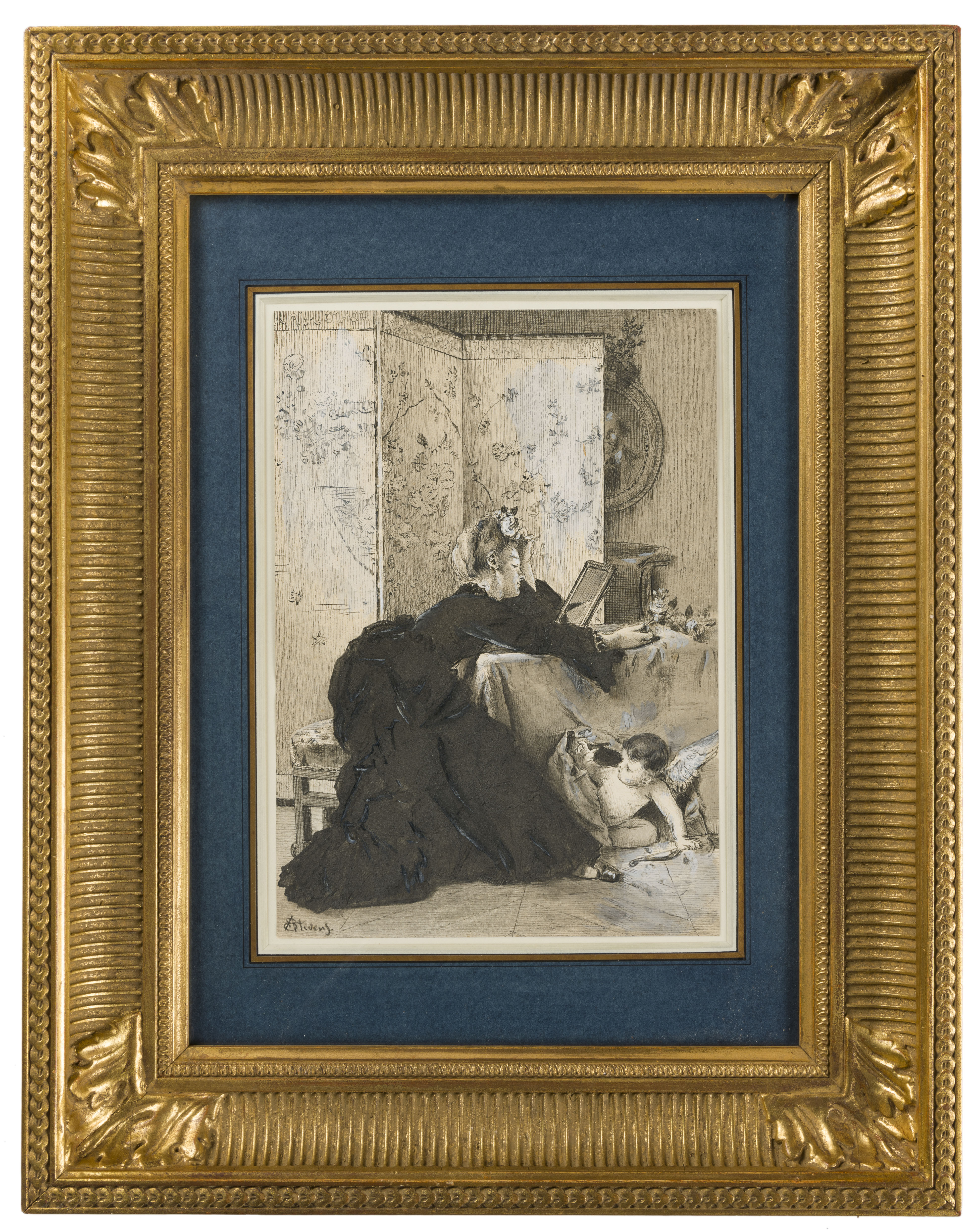 The present sheet is related to Alfred Stevens’ painting The Young Widow (La jeune veuve) of c.1873-1874, today in the Musée Royal de Mariemont in Morlanwelz, south of Brussels. The painting was purchased in April 1875 from the Brussels art dealer Henry Le Roy et fils by the Belgian collector Arthur Warocqué (1835-1880), whose widow later presented it to the museum. As Peter Mitchell describes the subject, ‘The young widow in black, with the portrait of the lost husband in the background, looks in the mirror to reassure herself that she is still attractive and able to attract a new admirer. She need have no worries because the promise of new love is assured by the well-timed appearance of Cupid from under the table.’ In his monograph on Stevens, published in 1906, Camille Lemonnier described The Young Widow as having ‘the charming caprice of a Fragonard’.