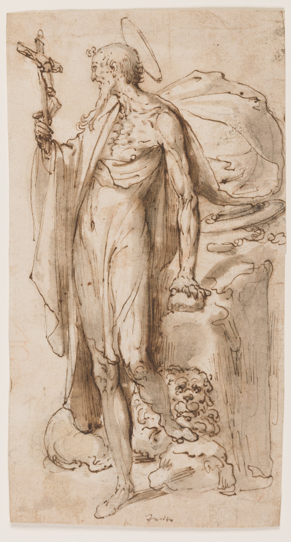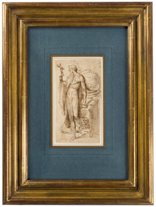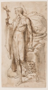 The present sheet may be likened to such stylistically comparable drawings by Giovanni Battista Lombardelli as a study of two hermit saints in the Albertina in Vienna and a drawing of Scenes from the Life of Saint Anthony Abbot, preparatory to the frescoes in San Antonio Abbate in Rome, in the Metropolitan Museum of Art in New York. Two drawings in the Louvre - one of Three Scenes from the Life of Saint Anthony Abbot, likewise related to the San Antonio Abbate frescoes, and the other of A Saint Reviving a Drowned Man - may also be compared to the present sheet, as can a drawing of The Virgin and Child with Saints John the Baptist and Francis(?) in a New York private collection, which has recently been attributed to both Raffaellino da Reggio and his pupil Lombardelli. Other drawings by Lombardelli are today in the collections of the Kupferstichkabinett in Berlin, the Uffizi in Florence, the Museo del Prado in Madrid, the Biblioteca Ambrosiana in Milan, the Istituto Centrale per la Grafica in Rome, and elsewhere.
