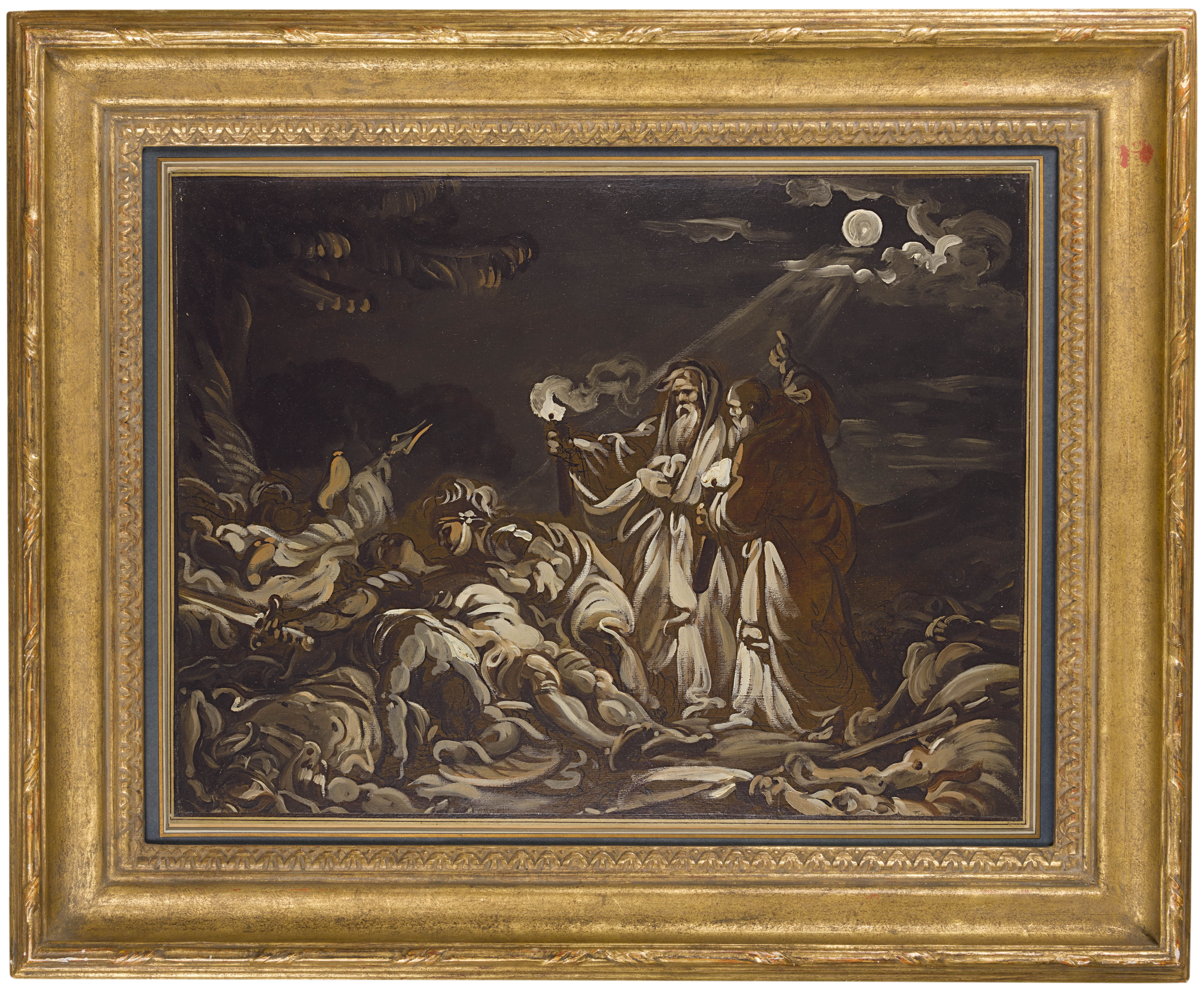 The attribution of this oil sketch, previously given to Jean-Baptiste Deshays (1729-1765) is due to Alastair Laing. The free handling of the paint in this nocturnal scene finds parallels in a number of coloured oil sketches by Berthelémy, such as the Queen Tomyris Dipping the Head of Cyrus into a Basin of Blood in the Musée des Beaux-Arts in Nîmes, which is a study for a large painting of 1766 in the same collection. Laing also notes some stylistic comparisons with two freely executed oil sketches of Apollo and Sarpedon5, both of which are preparatory for a painting that was Berthelémy’s morceau de reception for the Academie Royale in 1781, today in the Musée Saint-Didier in Langres, as well as with a sketch 'en camaïeu brun' of The Nurse of Nero Pouring his Ashes into the Tomb of his Ancestors, which was on the art market in 1985-1986.
