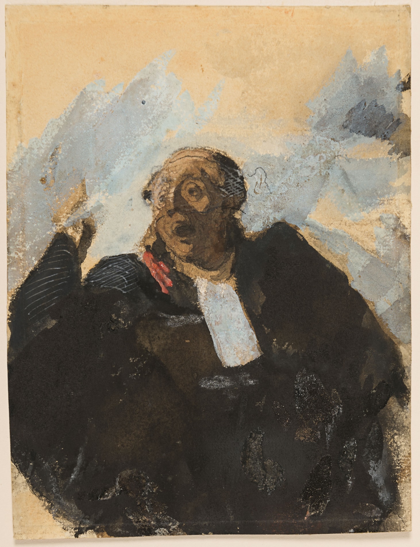In the 1830s Honoré Daumier became a regular visitor to the Palais de Justice in Paris, and he portrayed scenes from the law courts in around two hundred lithographs, drawings, watercolours and paintings over the next thirty years. As Colta Ives has noted, ‘Lawcourts, which were the centers of great influence and authority in nineteenth-century France, aroused the attention of Daumier to an exceptional degree. In fact, no other artist has ever been quite so fascinated by the legal profession or has proclaimed its endemic weaknesses so vividly…His depictions of lawyers and court drama grew stronger in design and larger in meaning as he progressed from detailing specific personages and events to presenting simpler, generalized images of one or two figures symbolic of the profession and its practices…the fame of his prints was such that a market existed for drawings and watercolors which the artist produced for collectors, mainly during the 1860s…Daumier’s particular genius is evident in the stunning and disciplined clarity of his images. The artist never became mired in detail or narratives that required explanation, but instead concentrated on defining character through incisive description.’