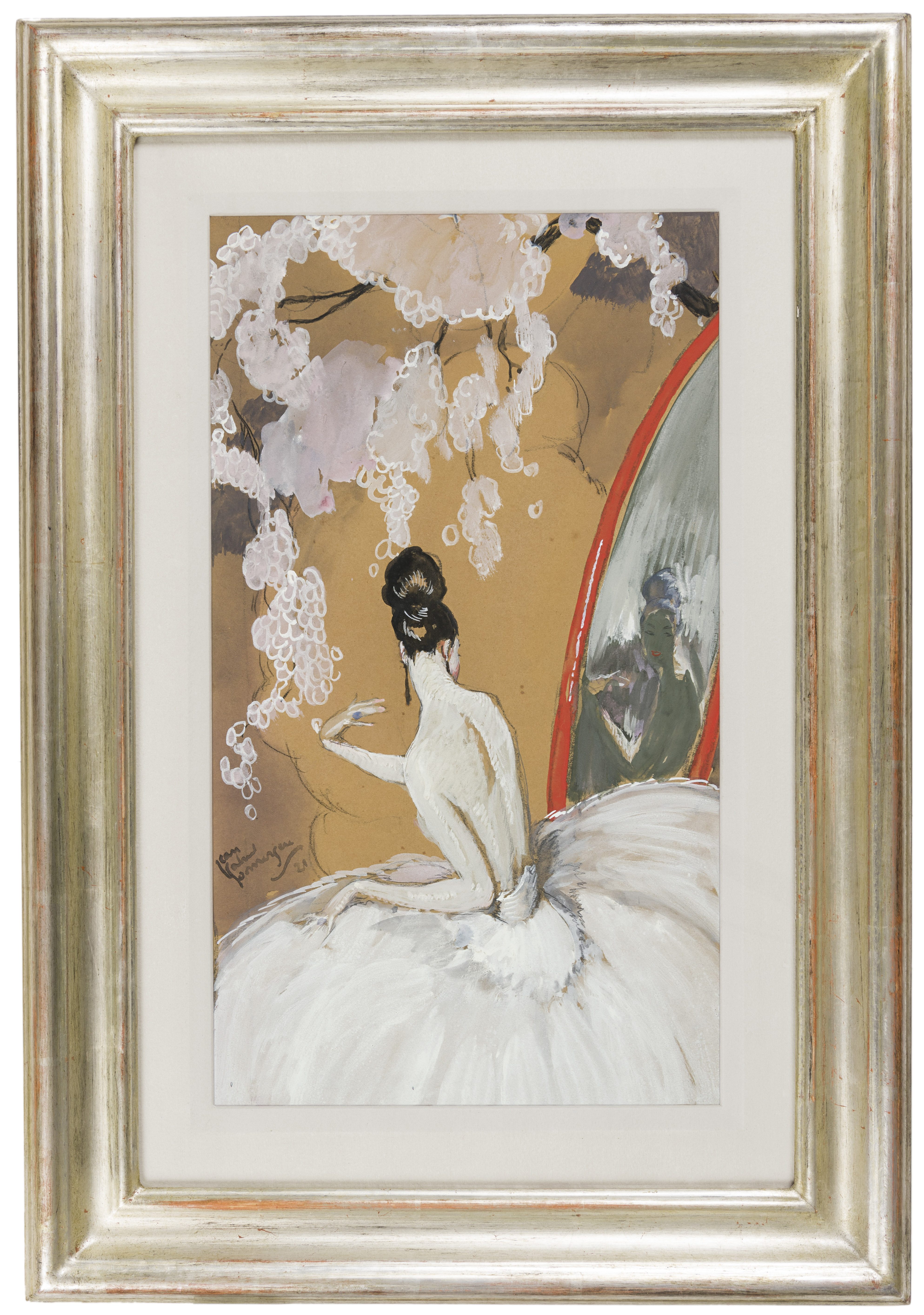 This gouache drawing may be related to a handful of similar compositions of a young woman seated in front of a tall mirror that Jean-Gabriel Domergue produced in the early 1920s. It is particularly close to the left half of a painting of Eve at a Mirror of 1921, which depicts a woman looking into a mirror held by a lascivious satyr, with a golden carriage behind. A variant of the composition, with the addition of a standing nude woman, is found in a gouache drawing, likewise dated 1921, which was sold at auction in 2012, while the artist also used a similar composition in a number of large folding screens. A painting of an analogous subject, entitled Dans l’ombre d’une jeune fille en fleur, dated 1922 and exhibited at the Salon of that year, depicts a woman with a fan, dressed in white, underneath a spray of wisteria.