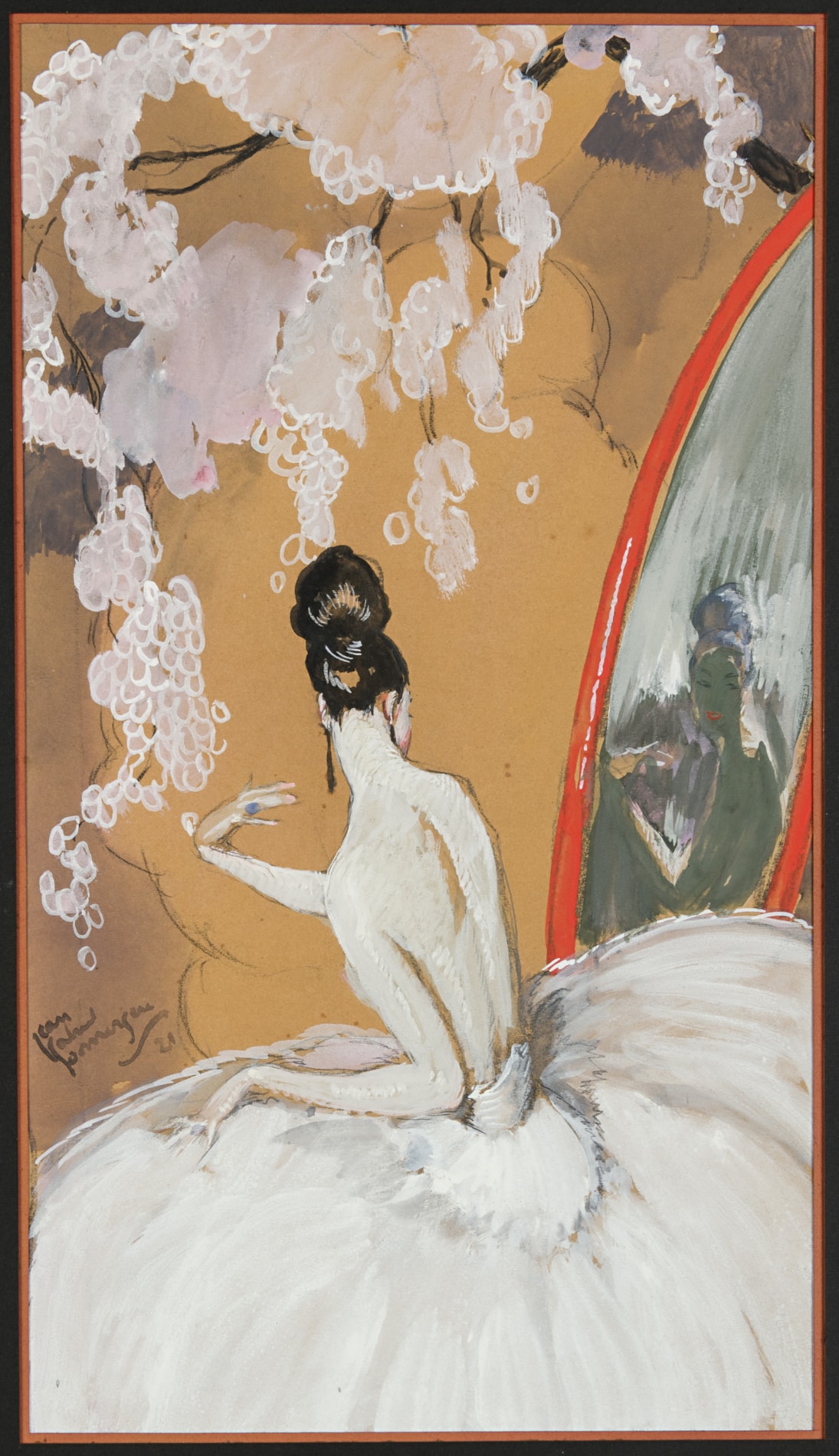 This gouache drawing may be related to a handful of similar compositions of a young woman seated in front of a tall mirror that Jean-Gabriel Domergue produced in the early 1920s. It is particularly close to the left half of a painting of Eve at a Mirror of 1921, which depicts a woman looking into a mirror held by a lascivious satyr, with a golden carriage behind. A variant of the composition, with the addition of a standing nude woman, is found in a gouache drawing, likewise dated 1921, which was sold at auction in 2012, while the artist also used a similar composition in a number of large folding screens. A painting of an analogous subject, entitled Dans l’ombre d’une jeune fille en fleur, dated 1922 and exhibited at the Salon of that year, depicts a woman with a fan, dressed in white, underneath a spray of wisteria.