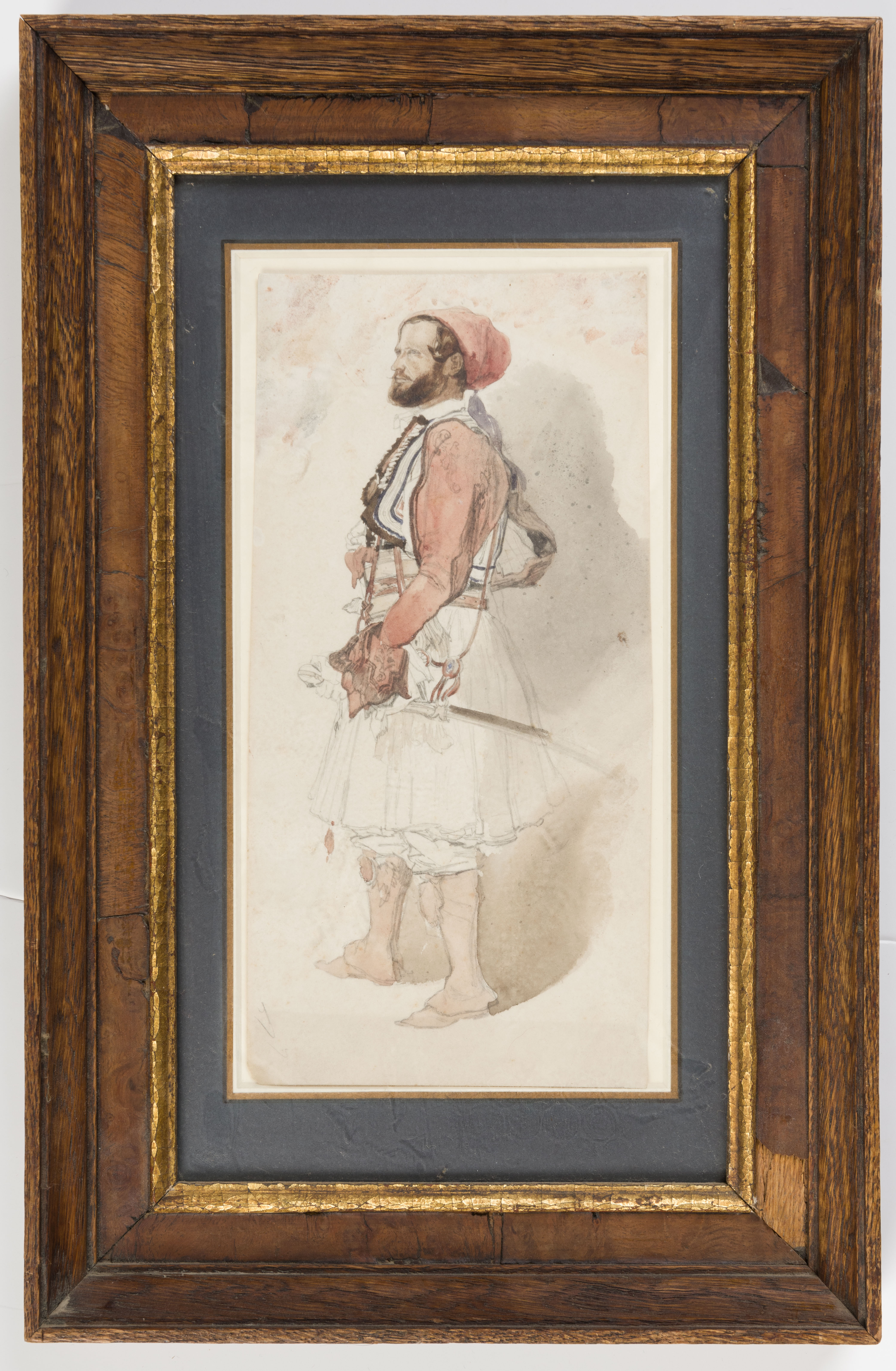 Albanian soldiers were to be found throughout the Near East and were particularly noted for their elaborate dress. The poet Lord Byron, who employed a number of Arnavuts as his personal guards, praised their costume as ‘the most magnificent in the world, consisting of long, white kilt, gold-worked cloak, crimson velvet gold laced jacket and waistcoat, silver mounted pistols and daggers’. A contemporary of Byron’s further remarked that ‘The Albanians or Arnauts...are extremely fond of gold and silver ornaments in their dress...The wealthier Arnauts have the outer vest of velvet and gold, richly interwoven with elegant ornaments...The breeches which are white are tied below the knees with a coloured garter...’