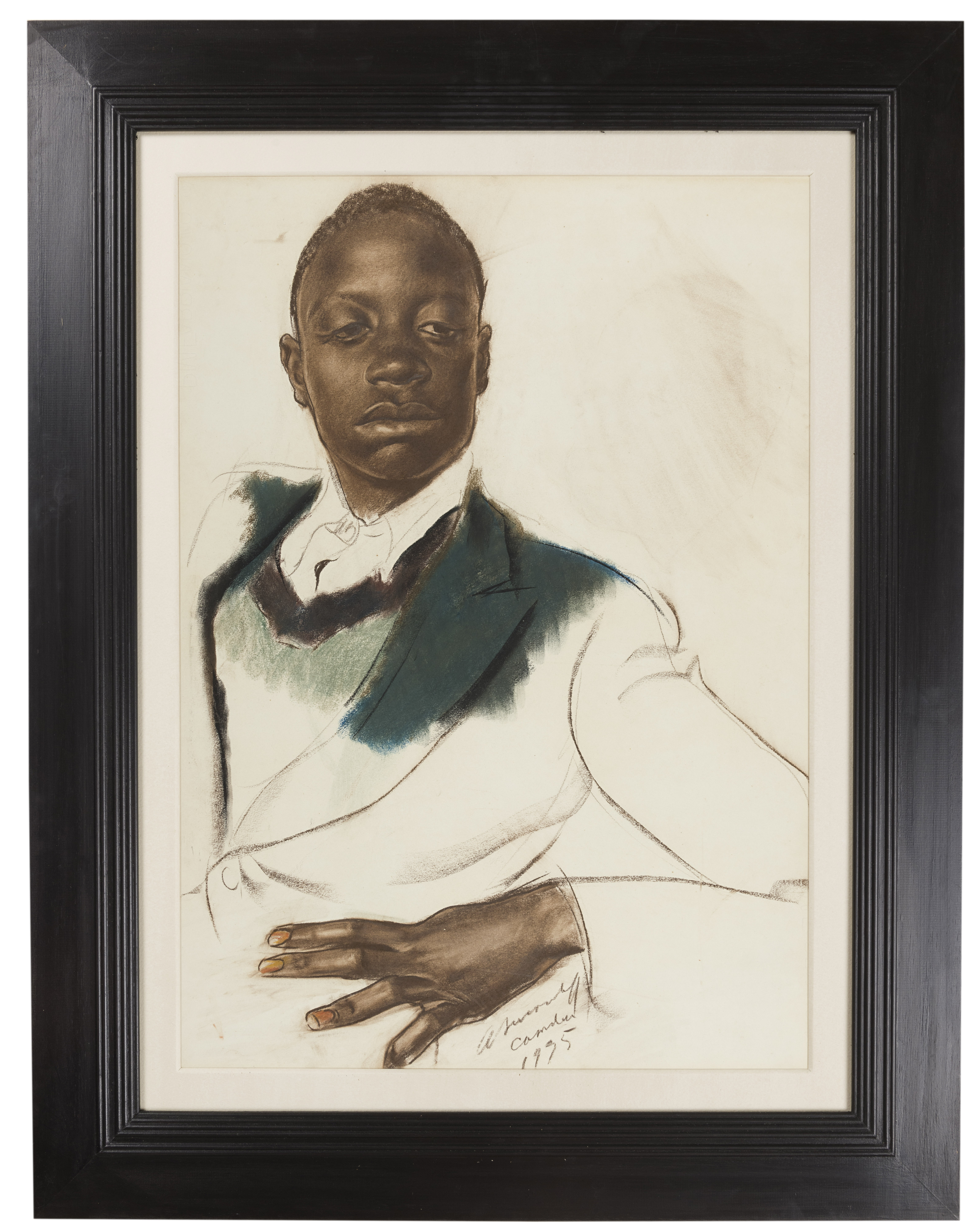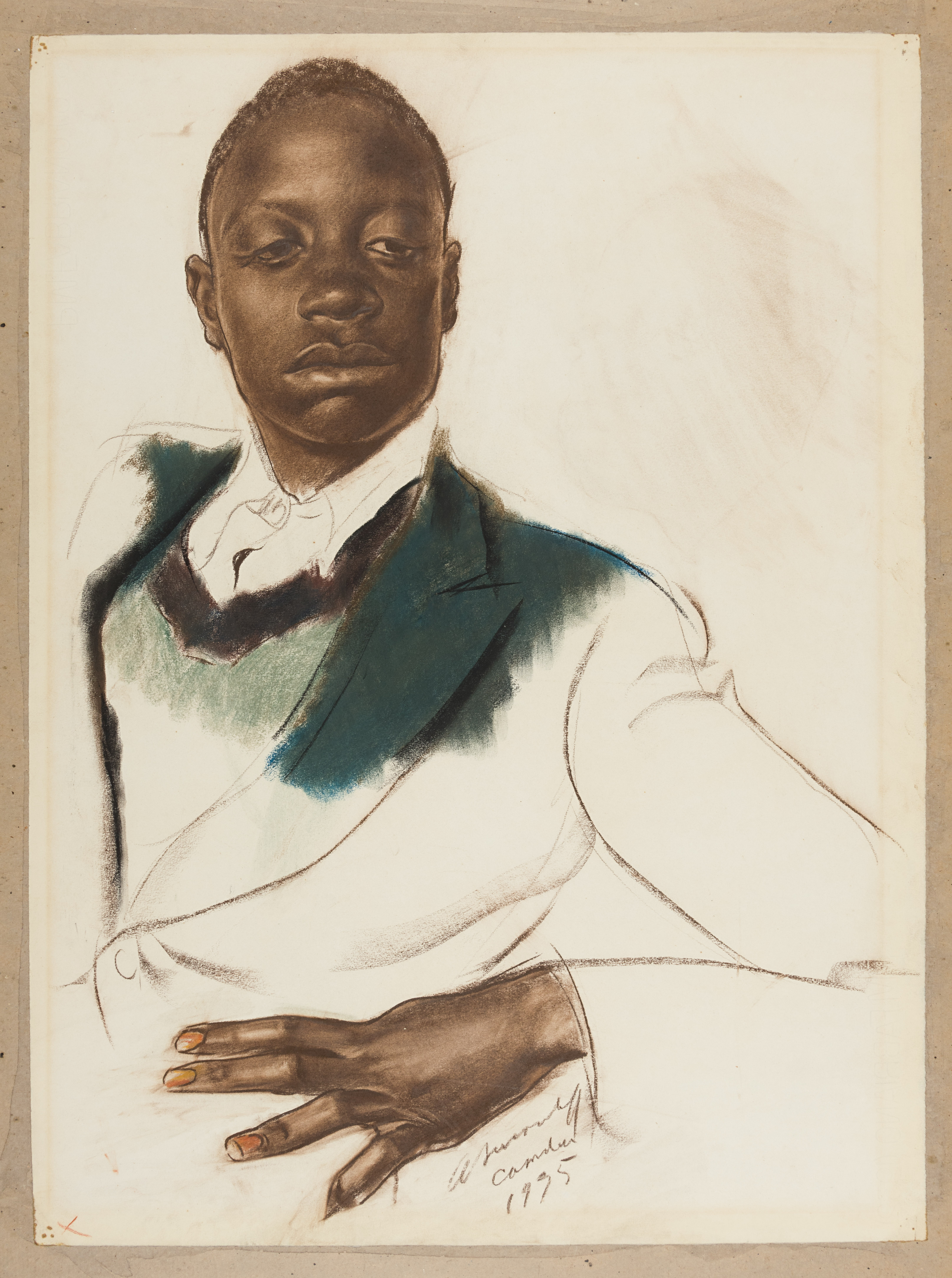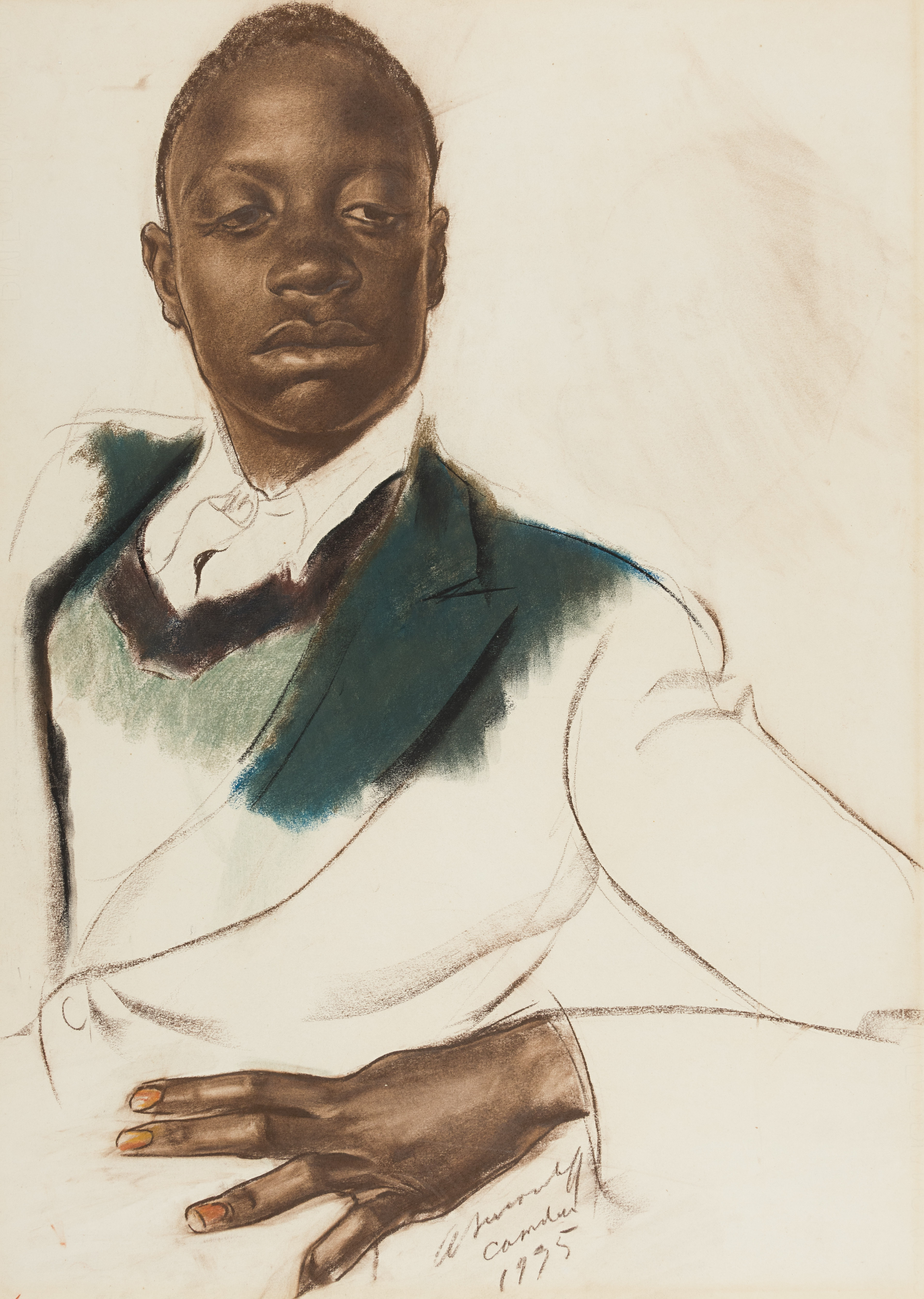 This large and striking portrait drawing was made during a stay by Alexander Yakovlev in the city of Camden in South Carolina in 1935, during which time he seems to have produced a number of portraits, as well as at least two depictions of a dance hall scene. The following year, in 1936, an exhibition of the artist’s work at the Knoedler Gallery in New York included three drawings entitled Josephine (Camden, South Carolina), The Black Plumber (Camden, South Carolina) and Cariebell (Camden, South Carolina). A few months later, another exhibition of Yakovlev’s work was mounted at the Gibbes Art Gallery of the Carolina Art Association in Charleston, South Carolina, and included some of the same works.