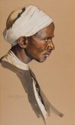 Dated 1938, the present sheet was drawn on one of Max Moreau’s visits to Tunisia. While the artist lived and worked mainly in Tunis, he also visited the island of Djerba and the towns and cities of Gabès, Kairouan, Kébili, Nabeul, Sfax and Sousse. As Moreau described the people of Tunisia, ‘What a pleasure it is for the enchanted portraitist who wanders through the labyrinth of the Arab city and the quartiers of the Hara. At every step are heads of character, at every street corner, living models out of the Bible. Misery, suffering, old age, disease have hollowed out this face; youth and beauty irradiate that one; this Bedouin woman passes like a princess in nameless rags of admirable colour; this grave rabbi bears on his features the full weight of a formidable past... Admirable draperies of which the Arabs have the secret, a burnous thrown proudly over the shoulder, turbans rolled up carefully or devilishly…And these hollowed, tormented faces, these eyes which keep the vision of deserts, these wrinkles which speak eloquently...’