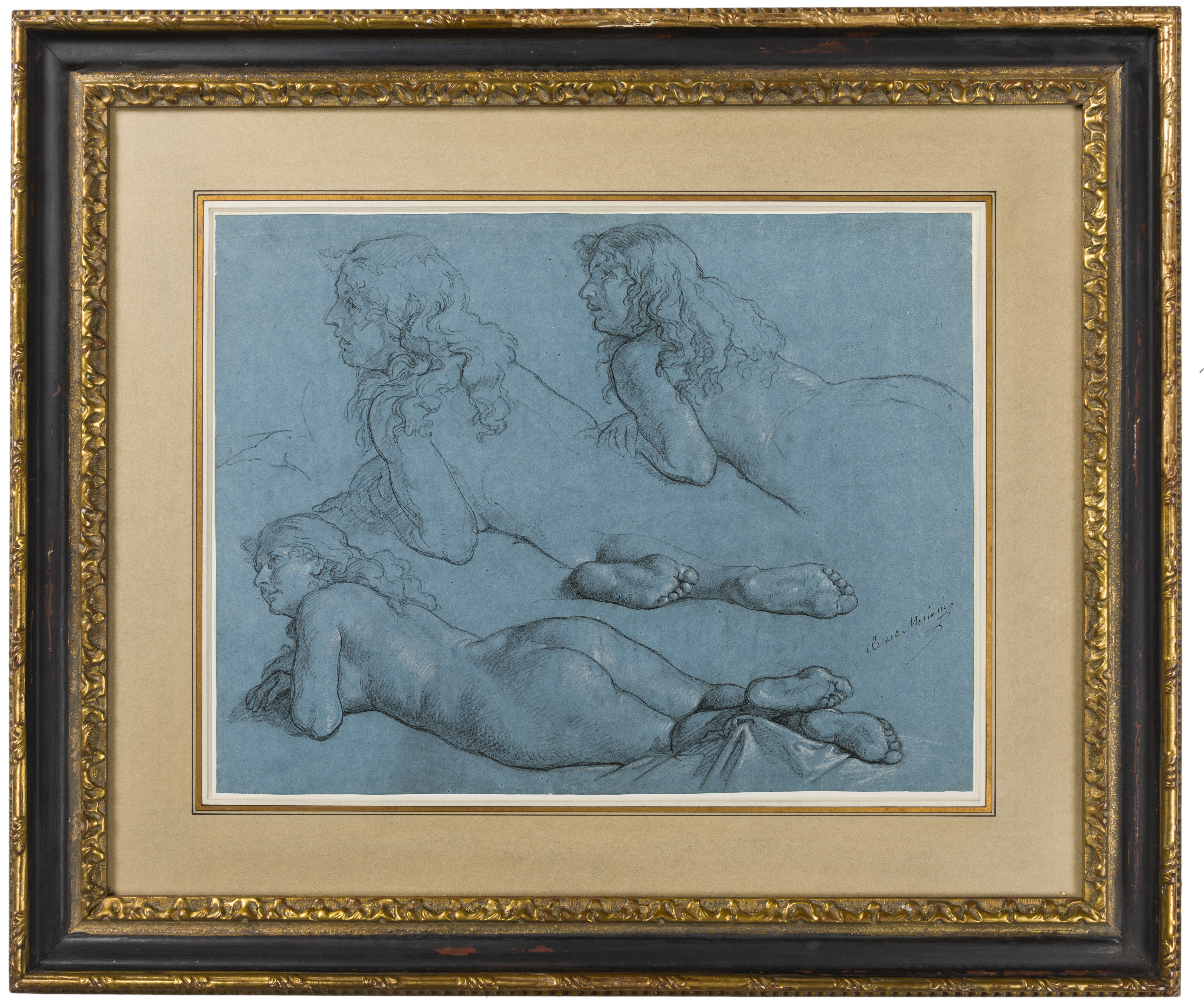 The present sheet, perhaps a study for a figure in an allegorical painting or fresco, provides a fine example of Cesare Mariani’s gifts as a draughtsman. As has been noted of this large drawing, ‘These Rubensian academic studies of a reclining female nude display a baroque lushness and an attention to light which Mariani derived from his teacher, [Tomasso] Minardi. Mariani has studied the model from three different angles, adding a detailed study of her feet and, at the left of the sheet, a partial outline of her hands. The several areas of pentimenti suggest that the artist quickly sketched the poses and then reworked the contours in a more complete manner. Mariani concentrated on the more highly finished figure of the model at the bottom of the page.’