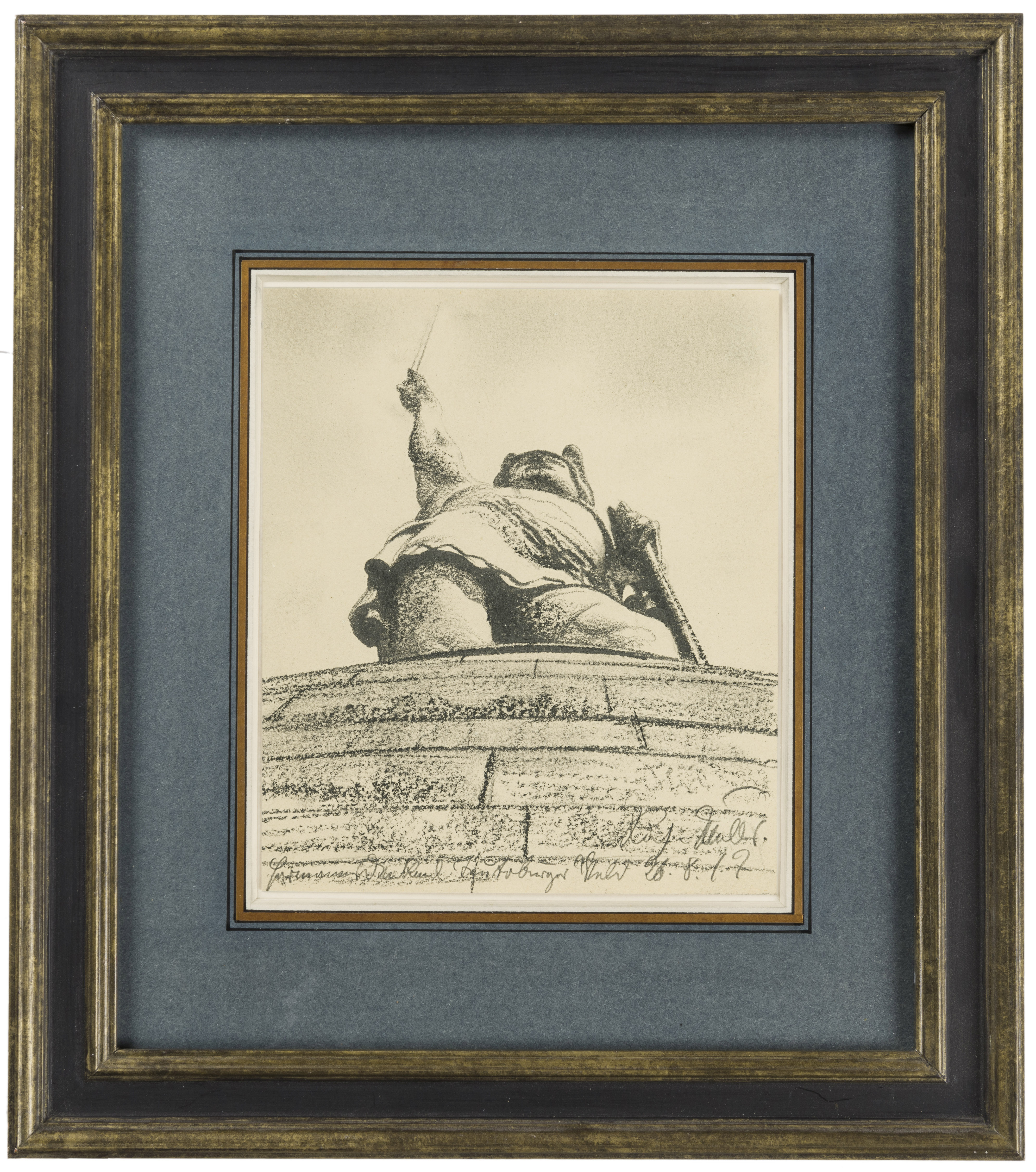 Drawn on 26th of August 1917, this drawing depicts the Hermannsdenkmal, or Hermann Monument, in the Teutoburg Forest in the German province of North Rhine-Westphalia. Seen here from its base, the colossal statue is dedicated to Arminius (later translated into German as Hermann), the war chief of the Cherusci tribe, who led an alliance of Germanic clans that defeated three Roman legions in battle in the Teutoburg Forest in 9 AD.