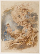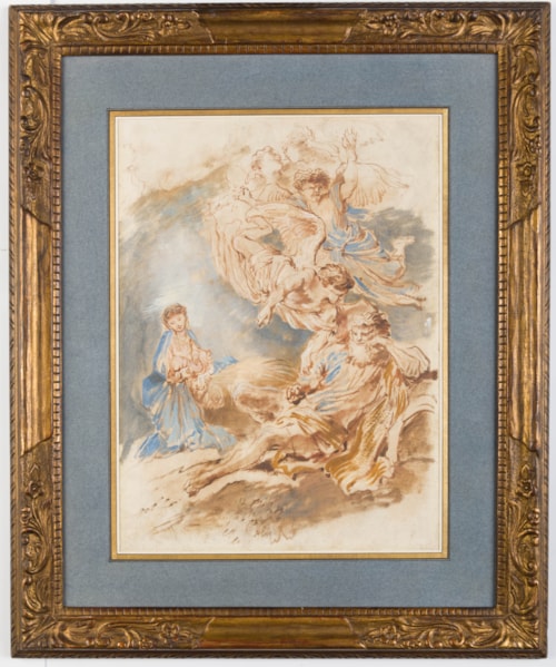 An analogous, albeit somewhat smaller, brush drawing of The Penitence of Saint Peter by Castiglione - which was, like the present sheet, at one time in the notable collection of the American banker and philanthropist Jules Semon Bache (1861-1944) - was on the art market in New York in 1999. Stylistic comparisons may also be made with a brush drawing of The Adoration of the Shepherds, formerly in the Mariette collection and today in the Hermitage in St. Petersburg and another of Angels Adoring the Virgin and Child in the Nationalmuseum in Stockholm.