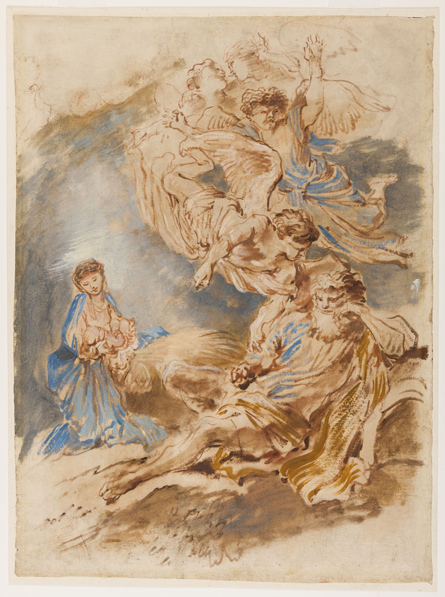 Although a late work by the artist, and probably datable to the late 1650s or early 1660s, it may be noted of the present sheet that the pose of the Virgin and Child is reminiscent of the same figure group in Castiglione’s monumental altarpiece of The Adoration of the Shepherds, signed and dated 1645, in the church of San Luca in Genoa, which is one of the artist’s earliest dated works, and among his most celebrated. An almost identical figure of the reclining Saint Joseph also appears in a brush drawing of The Angel Appearing to Saint Joseph in the Royal Collection at Windsor Castle.