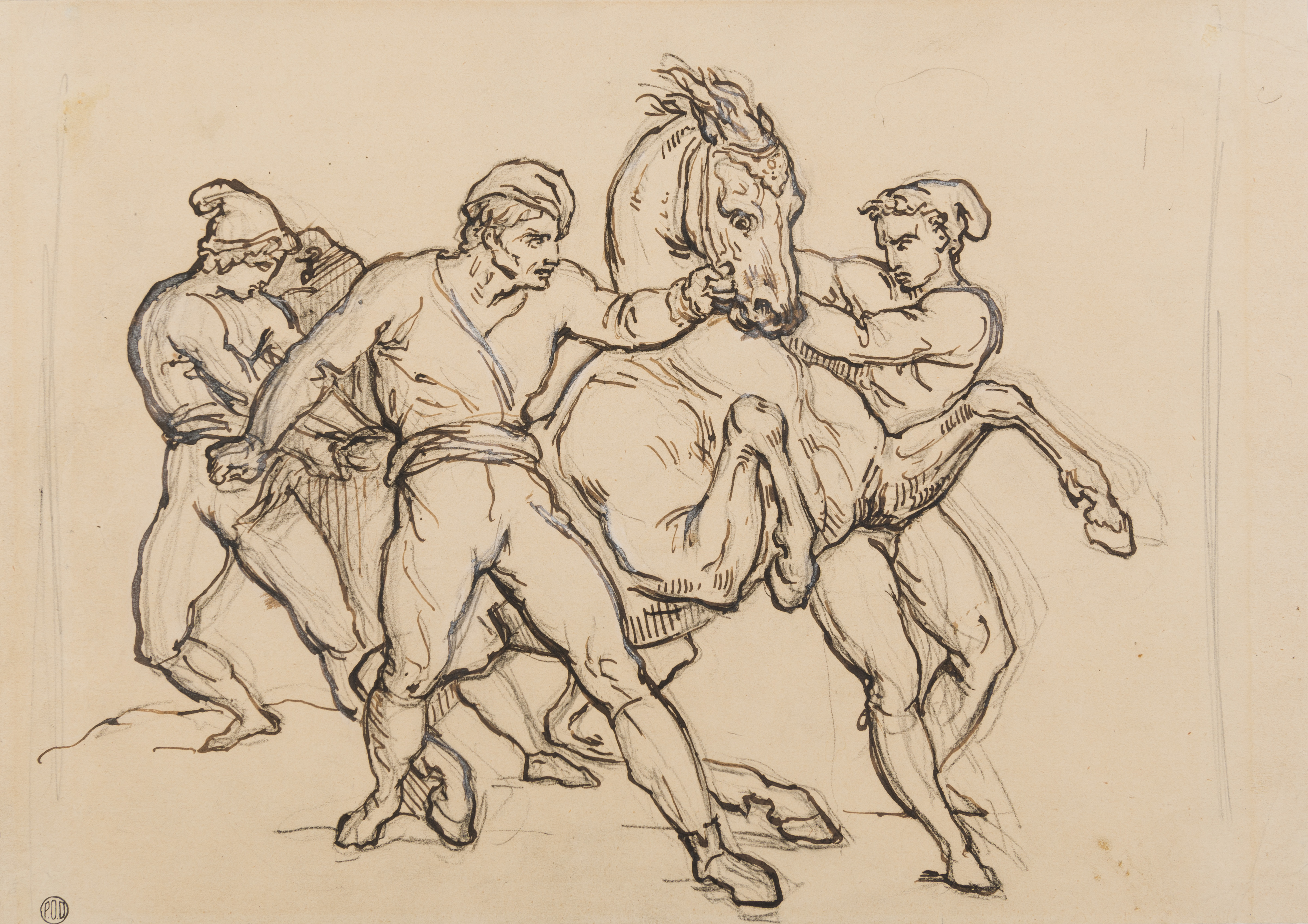 His posthumous sale, Paris, Hôtel Drouot, 27-29 May 1880, part of lot 74 (Cinquante calques et quelques croquis pour ses compositions les plus importantes telles que: Le Naufrage de la Méduse, les Courses de taureaux, les Barbieris, le Maréchal ferrant, le Marchand d’esclaves, Lion attaquant un cheval, figures académiques, épisodes des guerres de l’Empire, Mazeppa, voiture de soldats blesses, etc.)