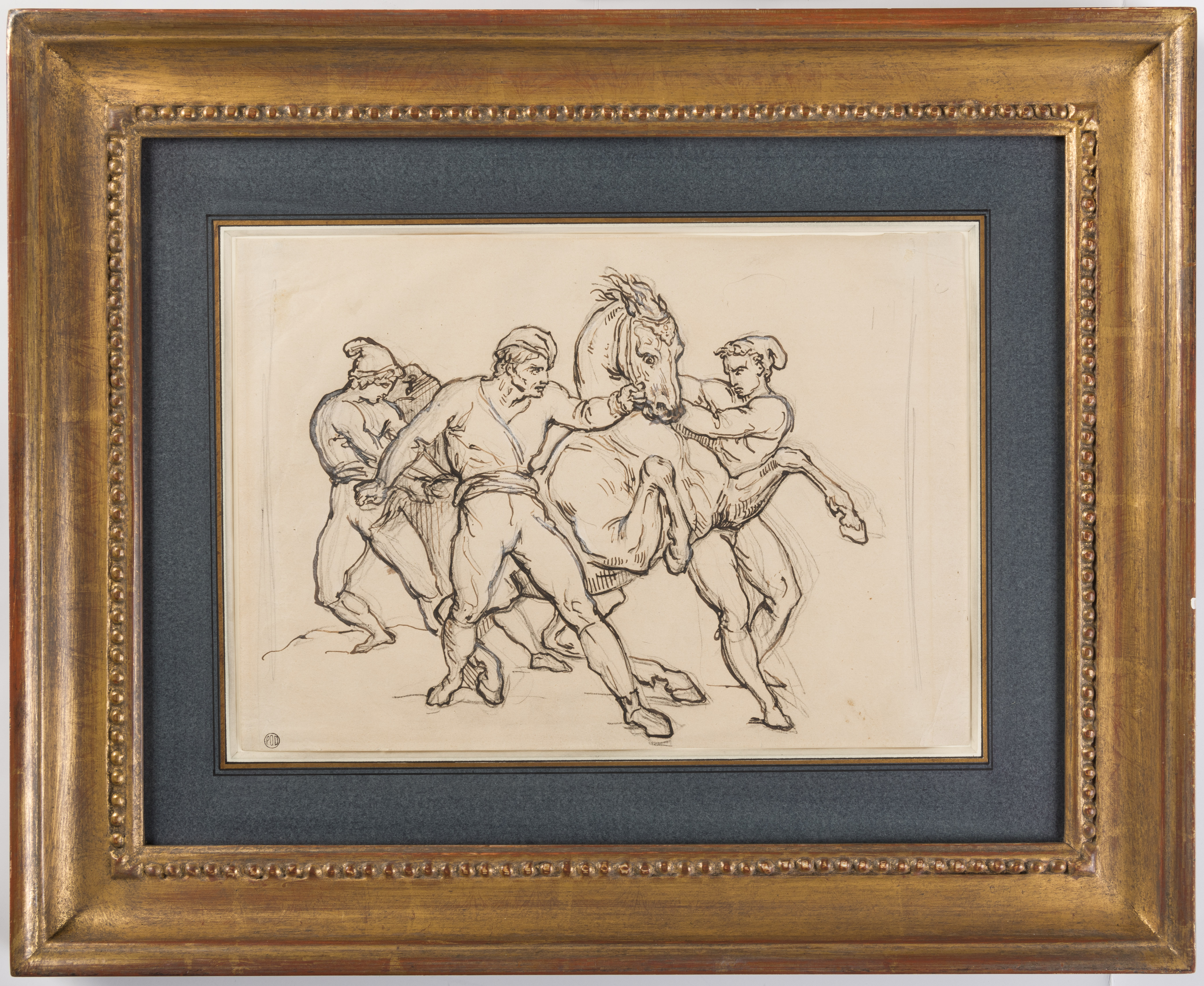 This figural group of four grooms restraining a rearing horse is the finest of several related versions of the same composition. In his 1879 catalogue of Géricault’s work, Clément listed four different drawn variants of this group. A smaller and more schematic drawing of this composition, likely to be a copy of the present sheet, was in a French private collection in the 1950s, while another smaller version, drawn in black chalk alone, was in a private collection in Paris and recently appeared at auction there. A lithograph by Alexandre Colin reproduces both the present study and another drawing by Géricault, of two men killing a bull, on the same sheet, while a tracing of this subject by Colin, in reverse, is also known. A small sketch of this figural group appears on a double-sided landscape drawing by Gericault in the Museum Boijmans-van Beuningen Museum in Rotterdam.