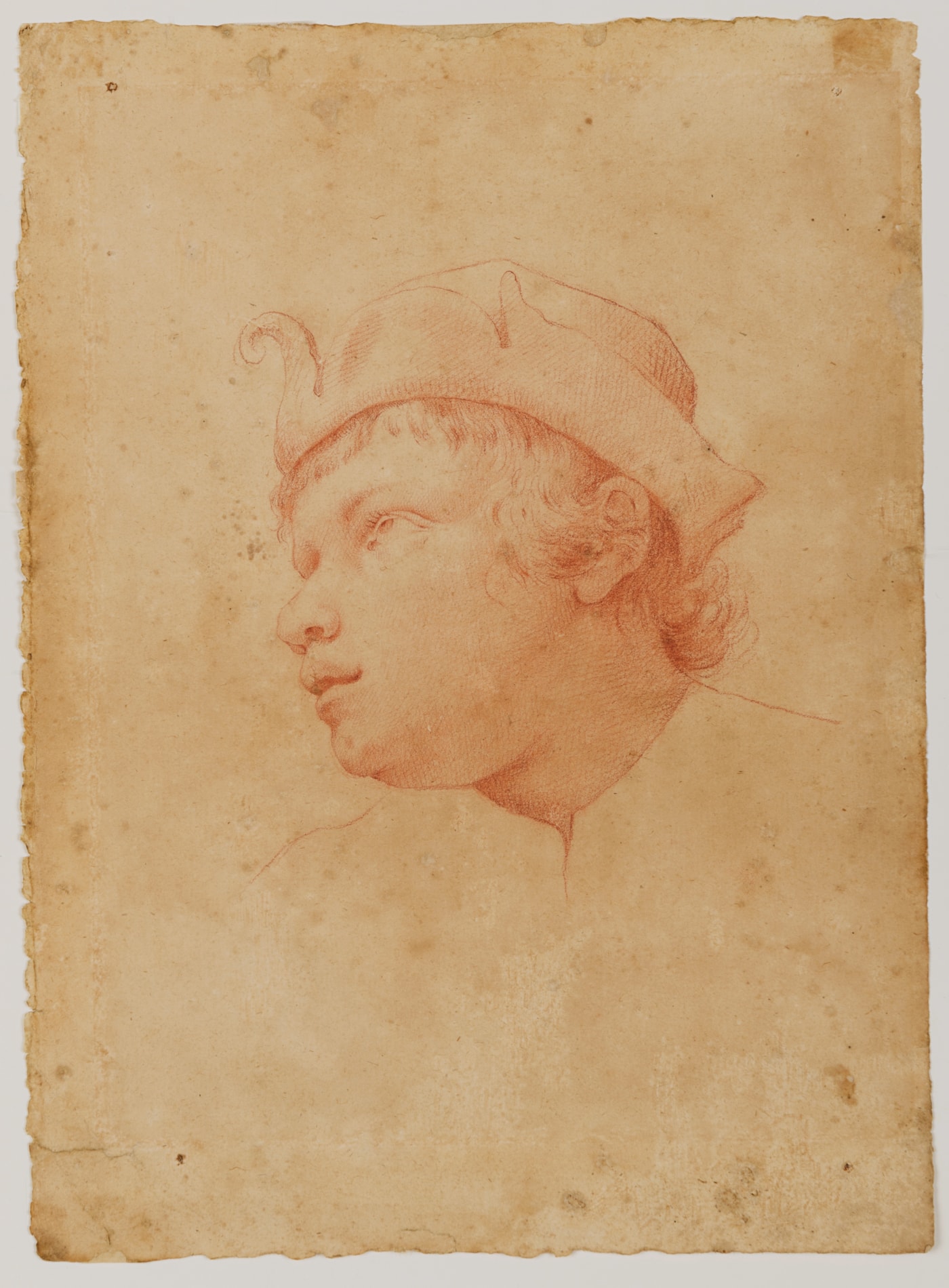 Carlo Dolci has been described as ‘the most sophisticated draughtsman of the Florentine seicento’, and his drawings were owned by such prominent Florentine collectors of his day as Baldinucci and Cardinal Leopoldo de’ Medici. The present sheet is a particularly fine example of the artist’s polished draughtsmanship, as has been noted by the Dolci scholar Francesca Baldassari: ‘This beautiful face of a young man, meticulously defined and with great refinement in every detail, is stylistically one of the most expressive heads drawn by Carlo Dolci. Within his graphic corpus, the most striking comparisons are to be found with the ‘Portrait of the Artist’s Wife’ (Paris, Musée du Louvre, Inv.1140), characterized by similar minute marks and intricate crosshatching, which in this drawing is particularly visible in the neck and the cheerful cap. A peculiar characteristic of Dolci, also evident in this ‘Head of a Young Man’, is moreover that the image is both ‘ideal’ and ‘natural’, which he achieves by defining and punctuating the roundness and purity of the face in every detail. Since it cannot be linked to any known work by Dolci, this [drawing] would appear to belong to the category of autonomous studies, conceived as works of art in themselves, of which the artist produced many examples. Although it is quite difficult to date Dolci’s autonomous graphic works due to the invariability of his drawing style, this ‘Head of a Young Man’ would seem to be dated between the 1640s and 1660s, when the painter broke away from [Matteo] Rosselli’s decorative style and achieved results similar to the purist and sharply defined style of his fellow countrymen Lorenzo Lippi and Ottavio Vannini.’