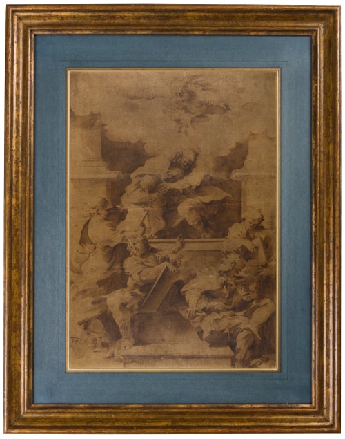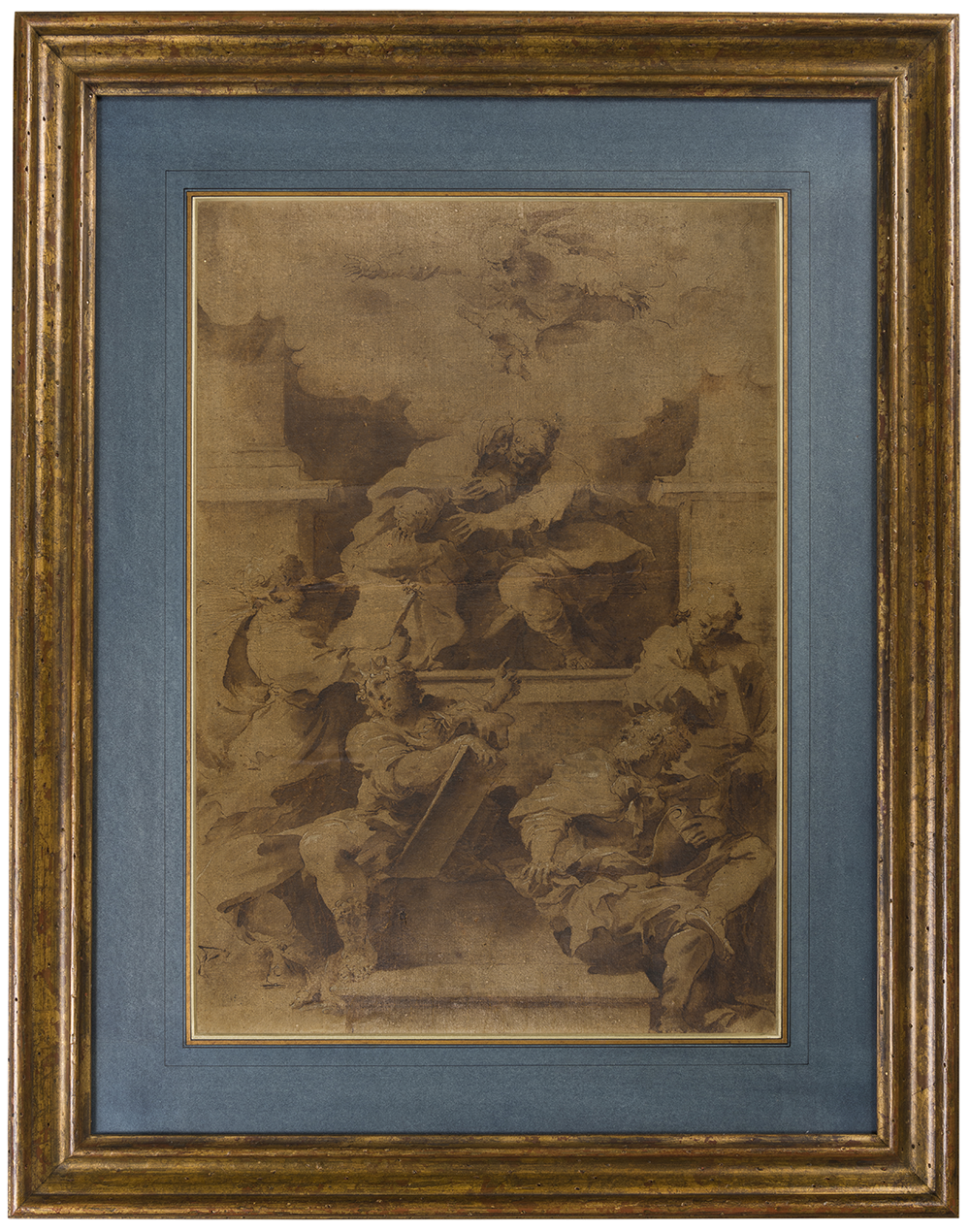 Faccini was particularly fond of altarpiece compositions on two levels. In the upper register of this drawing is shown the meeting of Joachim and Anna at the Golden Gate, attended by four seated or standing prophets below, while at the apex of the composition God the Father sends the Virgin’s soul or spirit down to her parents. It has been suggested by the Bolognese scholar Michele Danieli that this drawing - one of the largest drawings by the artist to have survived - is Faccini’s modello for an altarpiece in the church of San Giacomo in Bologna, which has been lost since the late 17th century. Although designed by Faccini, the painting is recorded by one 17th century Bolognese writer as the work of his pupil, the obscure Sienese painter Agostino Marcucci, ‘who painted in San Giacomo Maggiore the panel of the altar of the Cantofoli, known as the altar of Saint Anne, where there are some prophets...’ It was not uncommon for Faccini to provide finished drawings for his pupils and assistants to use.