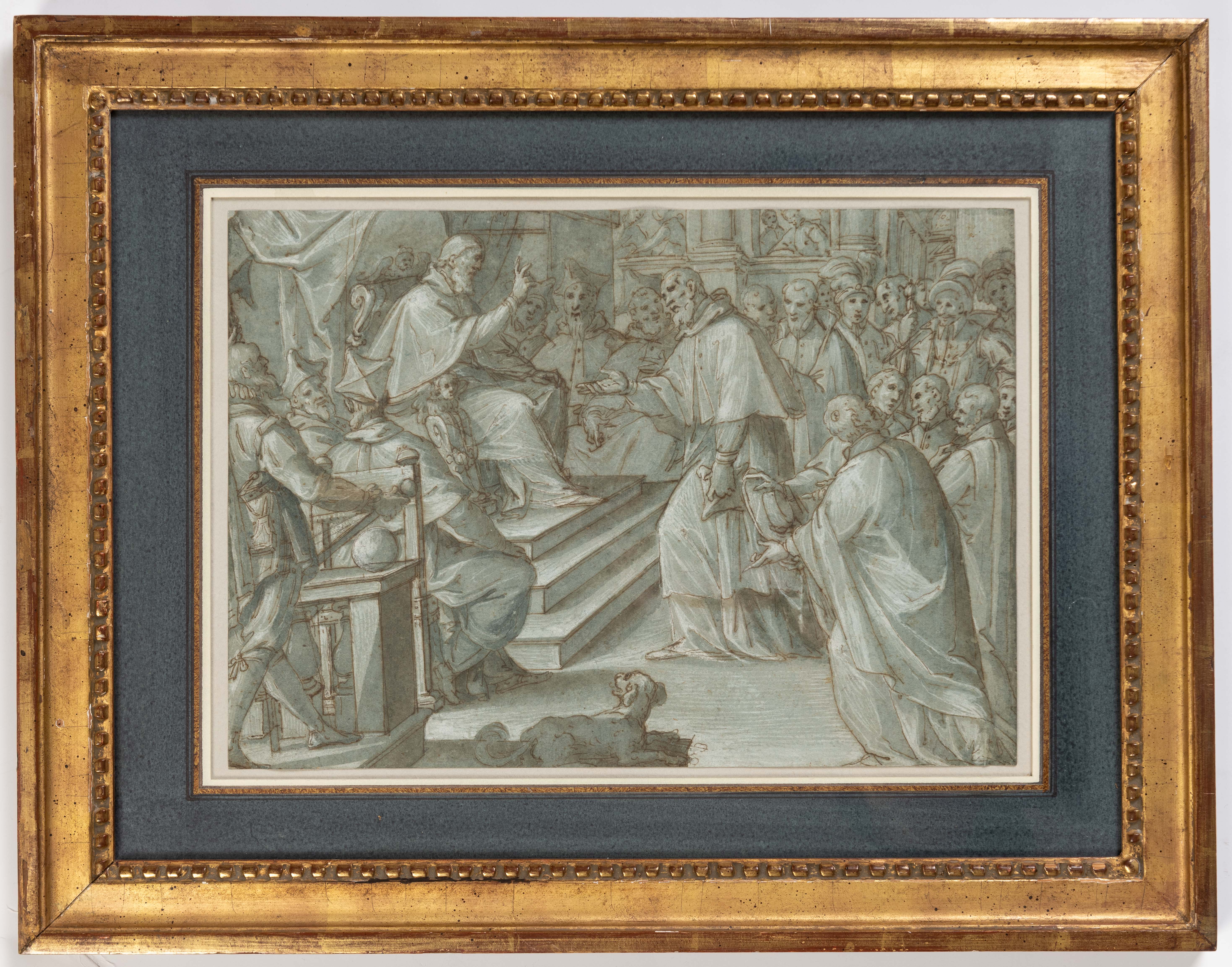 Among stylistically comparable drawings by Giovanni Battista Della Rovere are a study of The Meeting of Saints Carlo Borromeo and Filippo Neri in the Albertina in Vienna and a drawing of Saint Ambrose Tries in Vain to Take the Body of Saint Dionysus to Milan (which, like the present sheet, is dated 1618), formerly in the Marquis de Lagoy and Flury-Hérard collections; that drawing is a study for a fresco in the small church of San Dionigi in Cassano d’Adda, near Milan. Also similar is a drawing of Moses in the Szépmüvészeti Múzeum in Budapest, which is a preparatory study for a fresco in Sant’Angelo in Milan, and a study of A Bishop Saint (Ambrose?) Exorcising the Devil in the Art Institute of Chicago, as well as a drawing of a Scene from the Life of Saint Carlo Borromeo formerly in the collection of John and Alice Steiner.