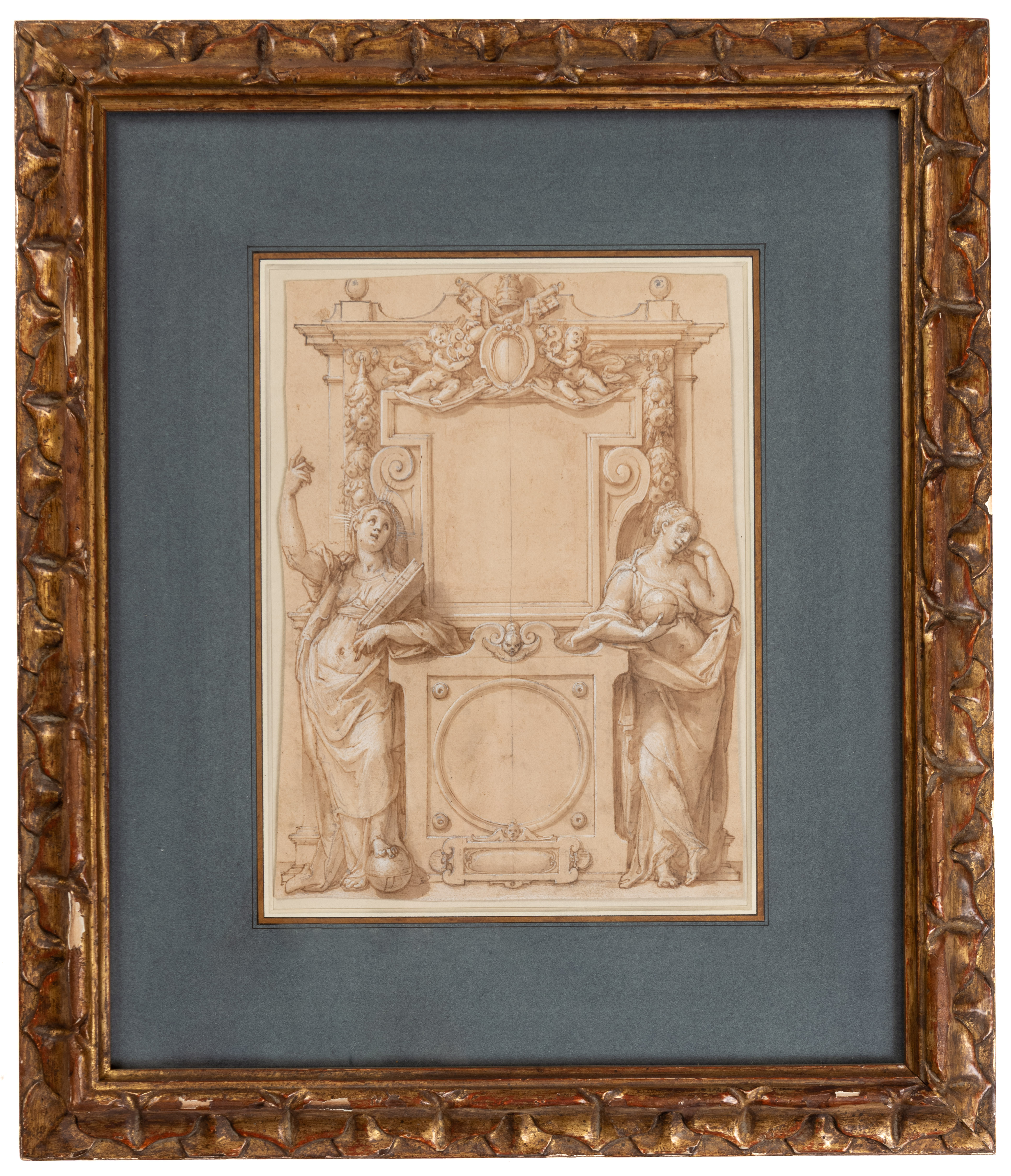 A similar composition is found in a drawing by Federico Zuccaro of a design for a wall monument to Ferdinando I de’ Medici, in the collection of the Milwaukee Art Museum, in which a sculpted bust of the Medici cardinal and future Grand Duke is flanked by allegorical female figures representing Hope and Faith. In both pose and style, the two allegorical figures in the Milwaukee drawing are closely paralleled by those in the present sheet, even to the extent that, like both figures in the Milwaukee sheet, the left-hand figure in this drawing is shown with her foot resting on a sphere.