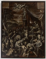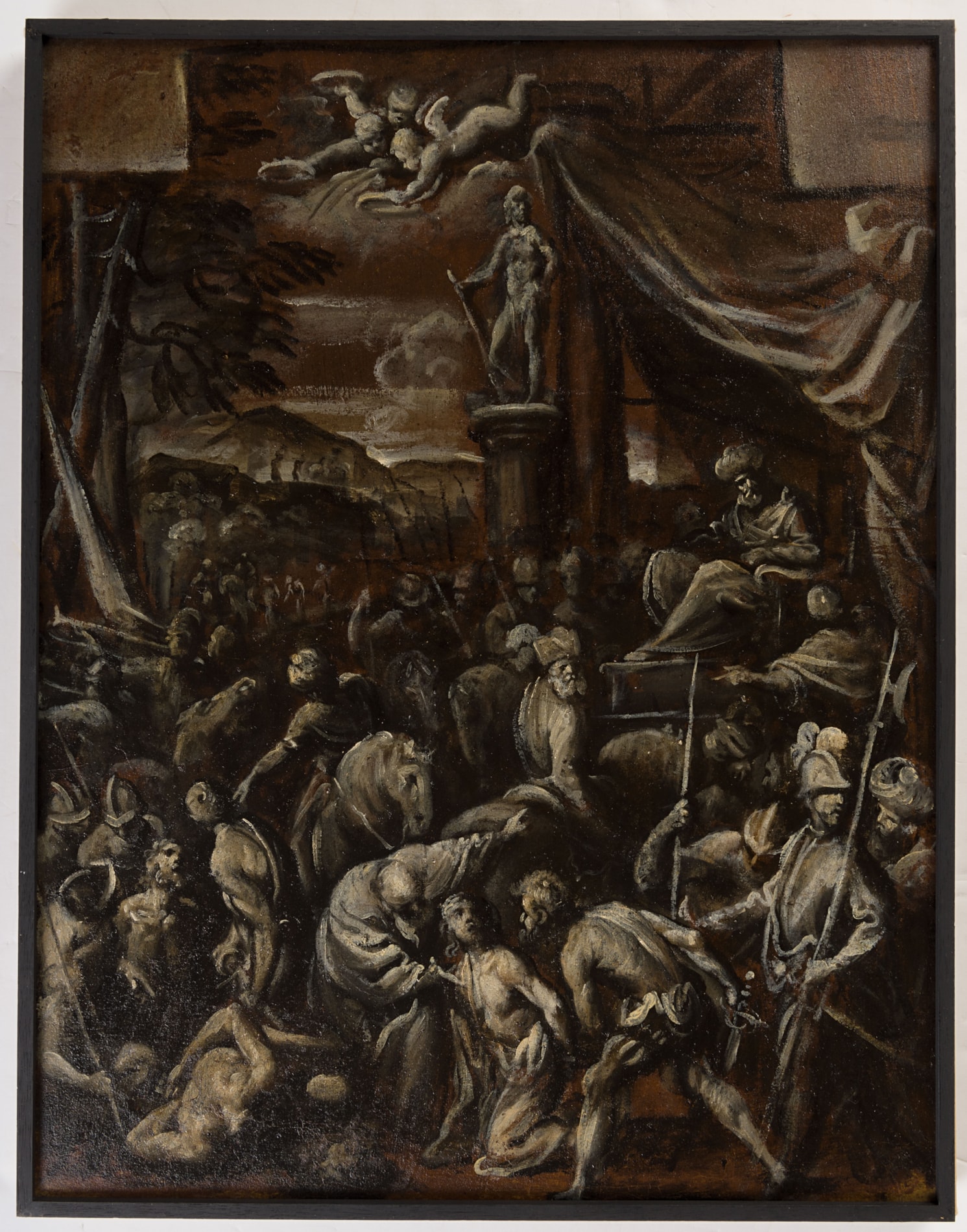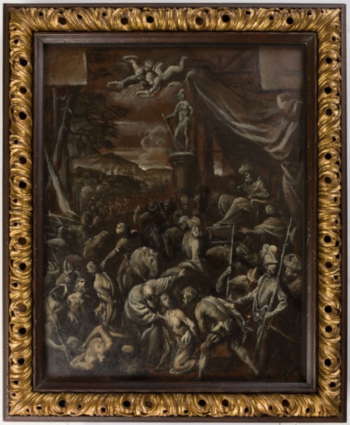 This oil sketch also appears to be related to a later painting of The Martyrdom of Three Saints in the church of San Pietro in Modena. The present sheet shares many of the same compositional elements, as well as the shape, of the painting in Modena, which has been dated to the 1620s and was formerly attributed to the 17th century Modenese painter Ludovico Lana (1597-1640).