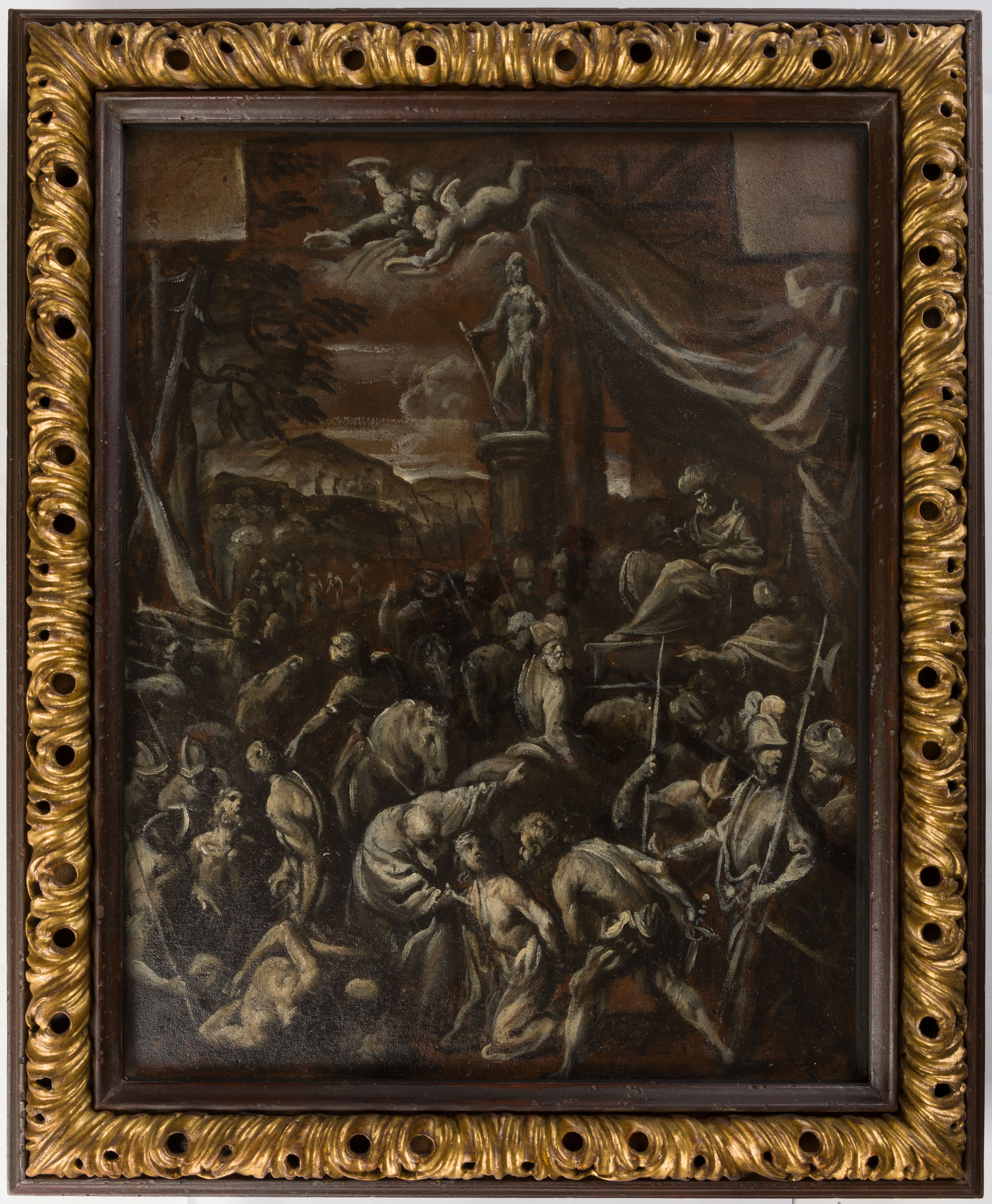 This oil sketch also appears to be related to a later painting of The Martyrdom of Three Saints in the church of San Pietro in Modena. The present sheet shares many of the same compositional elements, as well as the shape, of the painting in Modena, which has been dated to the 1620s and was formerly attributed to the 17th century Modenese painter Ludovico Lana (1597-1640).