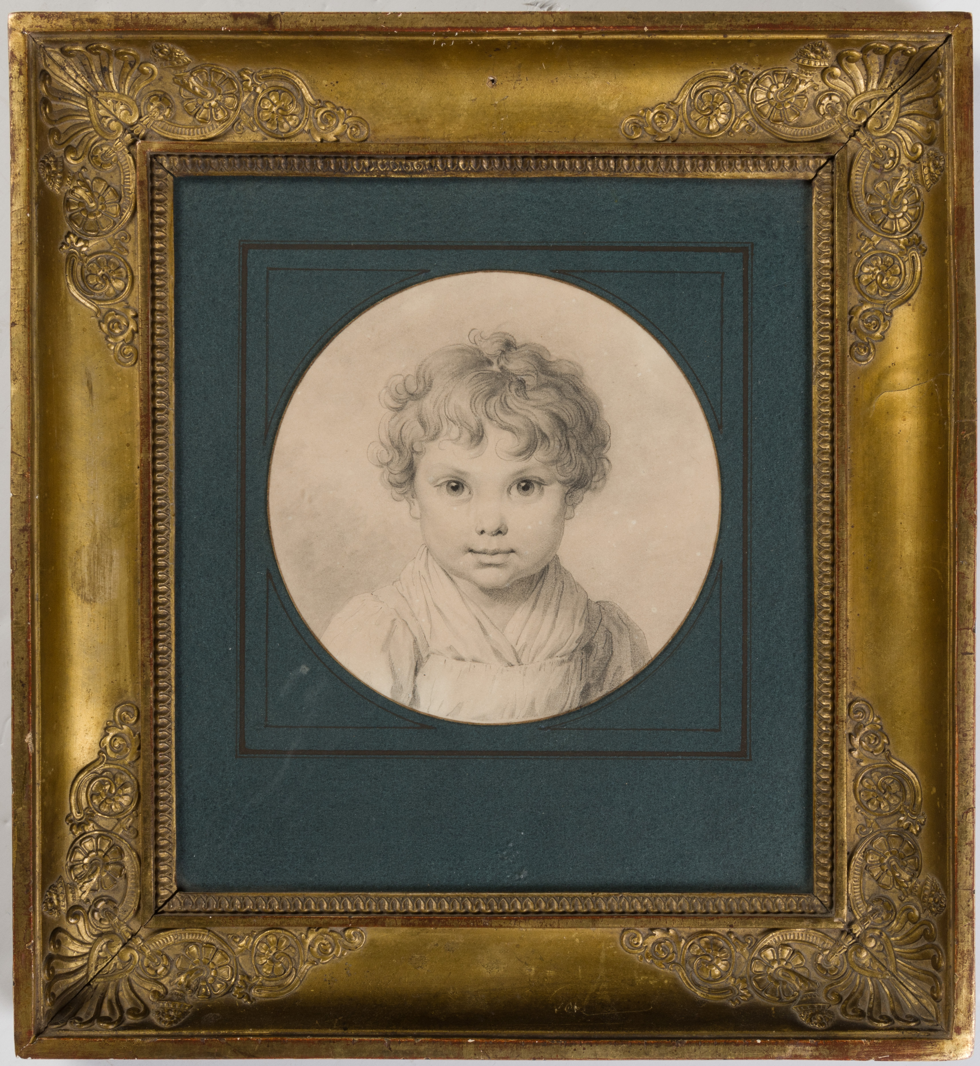 Drawings by Jean-Charles Tardieu are rare. As noted in the old pencil inscription on the backing board, the cherubic young boy in this portrait drawing is one of the artist’s sons. Tardieu and his wife Prudence had three sons; Alexandre, born in 1803, Jules Romain, born in 1805, and Armand-Louis, born in 1807. All three were born in Rouen, and would go on to have successful literary and legal careers. (Jules-Romain Tardieu was perhaps the most prominent of the three, becoming a well-known publisher and author.) As the second half of the inscription has become illegible, however, it is not possible to determine which son is depicted in this charming, intimate portrait drawing, which may be dated to between c.1805 and 1810.