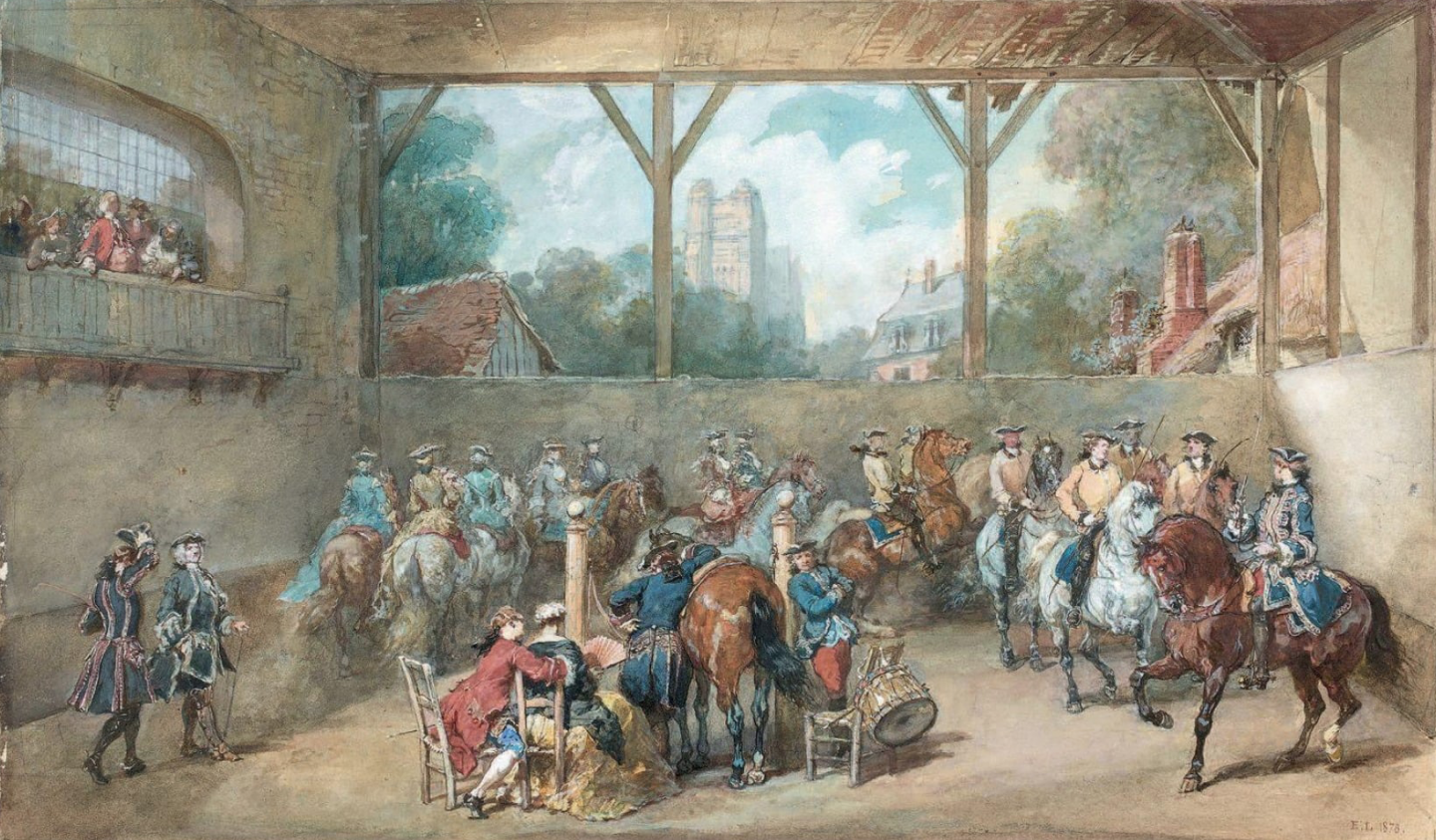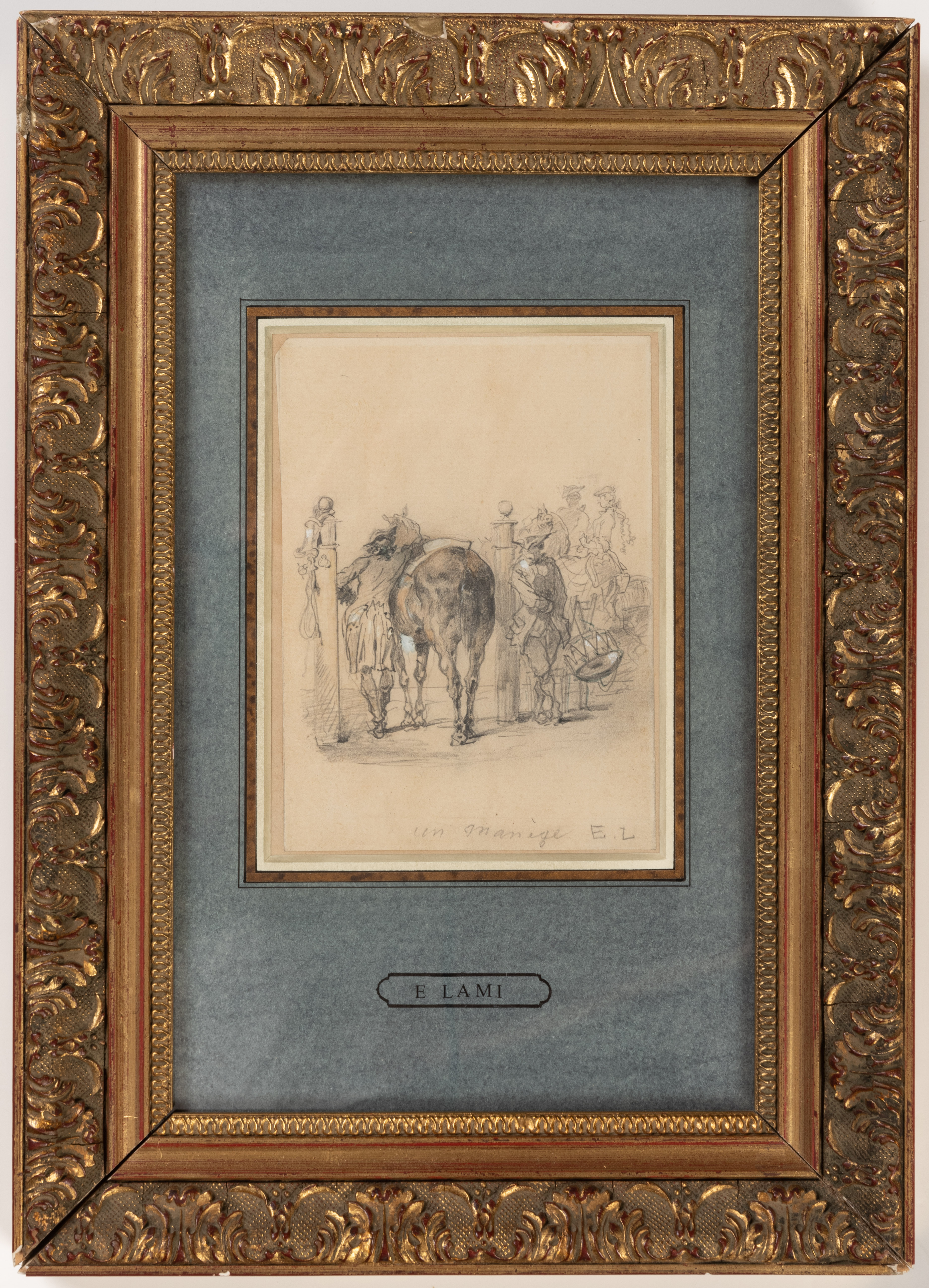 The present sheet is a study for the central portion of a large, finished gouache composition by Lami of the same title, depicting elegant figures in a riding arena and dated 1878, which was formerly in the Greffulhe collection and appeared at auction in Paris in 2017; it is now in an English private collection.