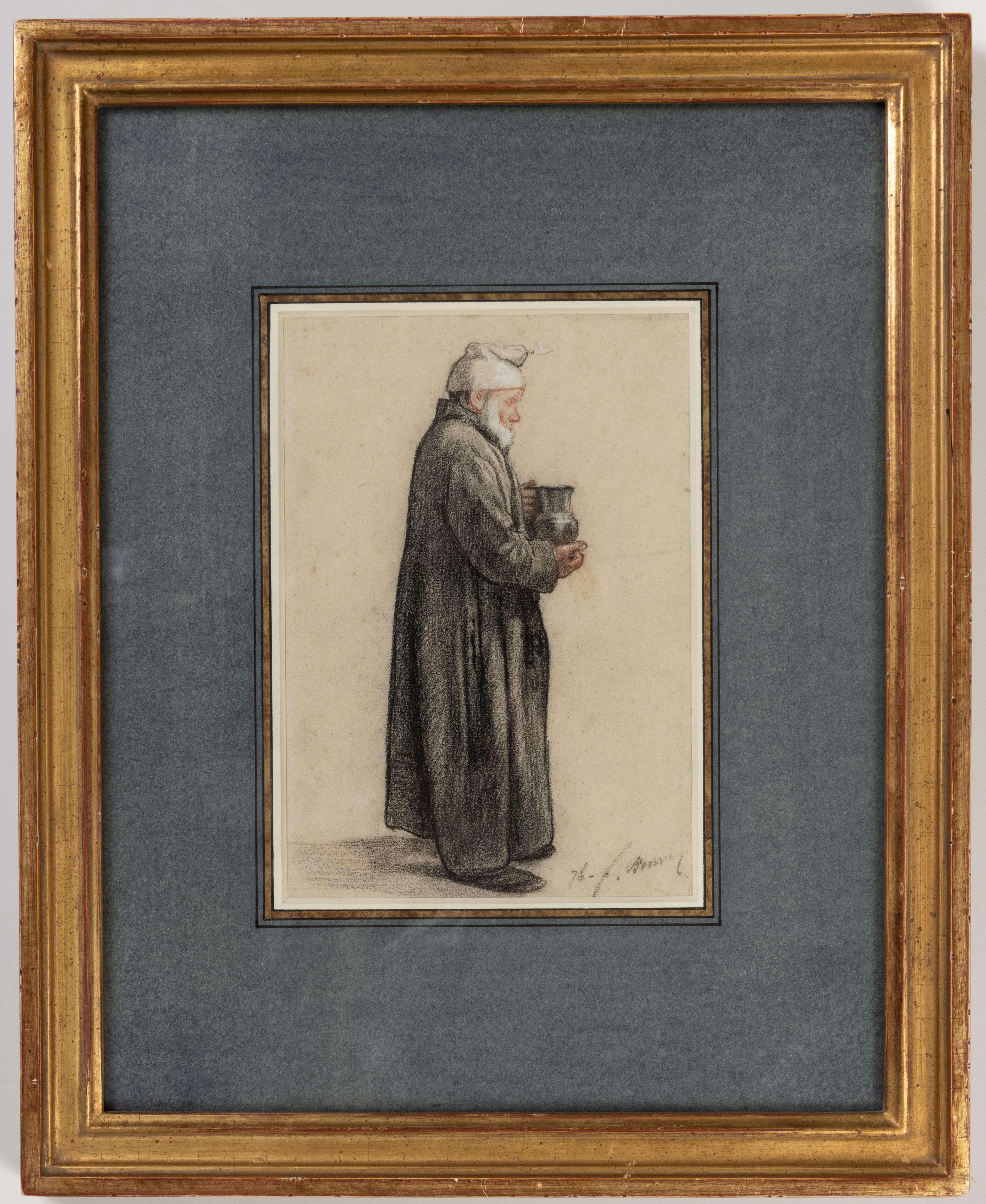 Bonvin’s modern reputation rests largely on his drawings. His first dated works were executed in 1845 and 1846, while he still worked as a civil servant. At this time he would exhibit his drawings informally under the arcades of the Institut de France, and it was there that he met his first significant patron, Louis Laperlier. At the start of his artistic career Bonvin would not be able to afford models, and would often make use of friends and their families as models, as well as washerwomen, cooks, nuns, children, peasants and beggars.